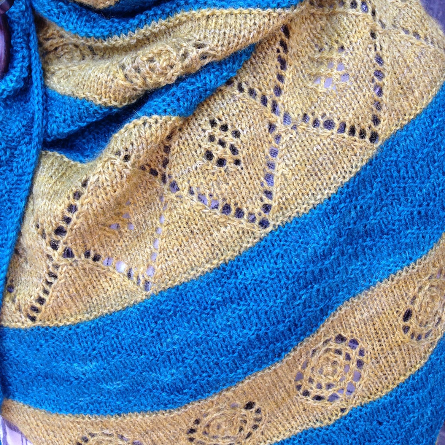 The Design - The turquoise blue Voyager section is ocean waves to symbolise the ship voyage to the West Indies. The yellow-green Jamaican Jewels section alternates between diamonds and medallion coins to symbolise the Jacobite treasure that Jamie and Claire go to the silkies’ isle to retrieve. The sample uses yarn dyed by the fantabulous Jess of Ginger Twist Studio.
