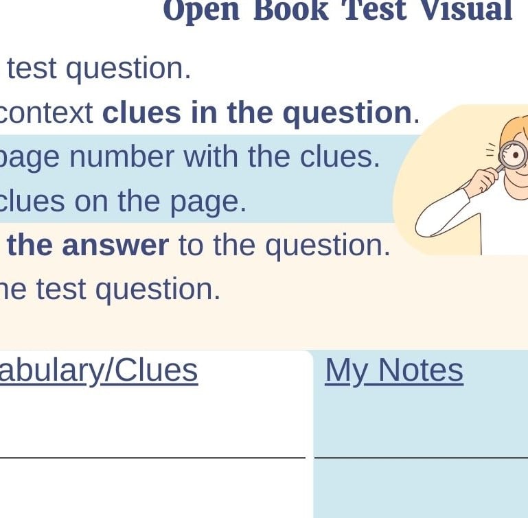 When your child has an open book test, it sounds like an easy A! Hold on. That may be the impression and even the expectation but students are still students. That is, they're still learning whether it's the vocabulary, concept or the executive skills required to perform well during an open book test. Support your child with this Open Book Test Visual to help them prepare, gain familiarity with their textbook, and have an extra boost of confidence during their open book test.
