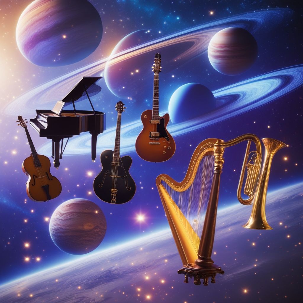 Render a stunning, ethereal scene featuring a variety of music instruments suspended in mid-air, set against a breathtaking celestial backdrop of vibrant, glowing planets, their rings and atmospheres luminous in shades of blue, purple, and gold, with a warm, soft light illuminating the instruments, including a grand piano, a sleek electric guitar, a vintage trumpet, a majestic harp, and a few more, each with intricate details and textures, while the planets, ranging in size and distance, display distinct characteristics, such as Saturn's prominent ring system, Neptune's icy blue hue, and a smaller, rocky planet in the foreground, with subtle, shimmering starlight adding depth and magic to the overall composition.