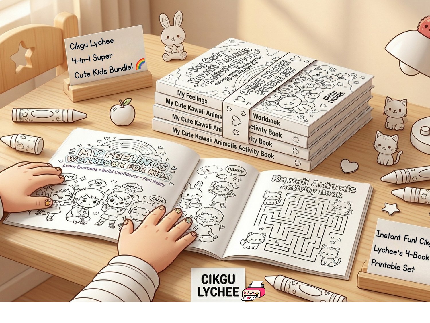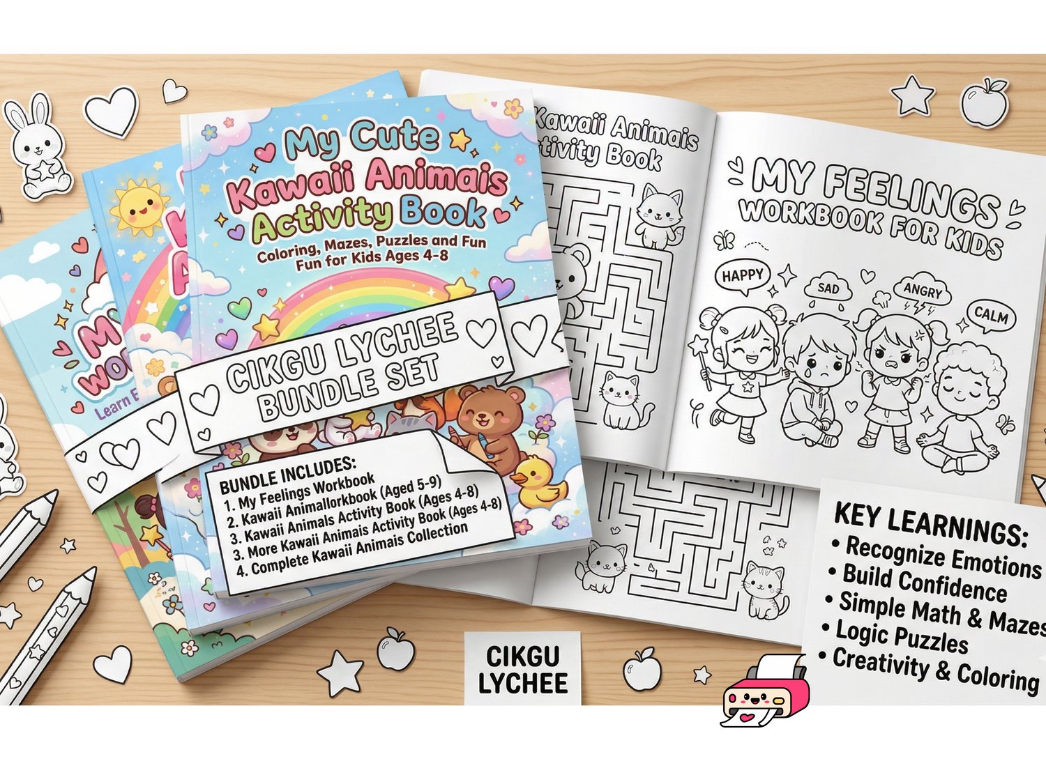 [Bundle Deal] Cikgu Lychee: 4-in-1 Kawaii Children's Activity Book Bundle - Feelings, Mazes & Animals (PRINTABLE)