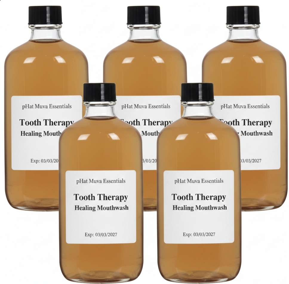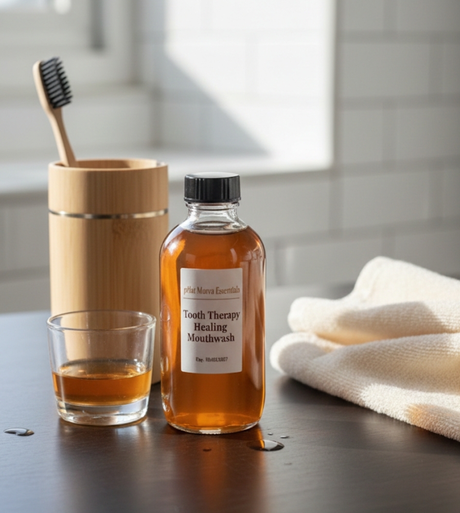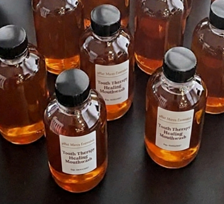 Tooth Therapy Healing Mouthwash is a handcrafted, alcohol-free oral rinse designed to support healthier teeth, stronger enamel, and refreshed breath naturally.