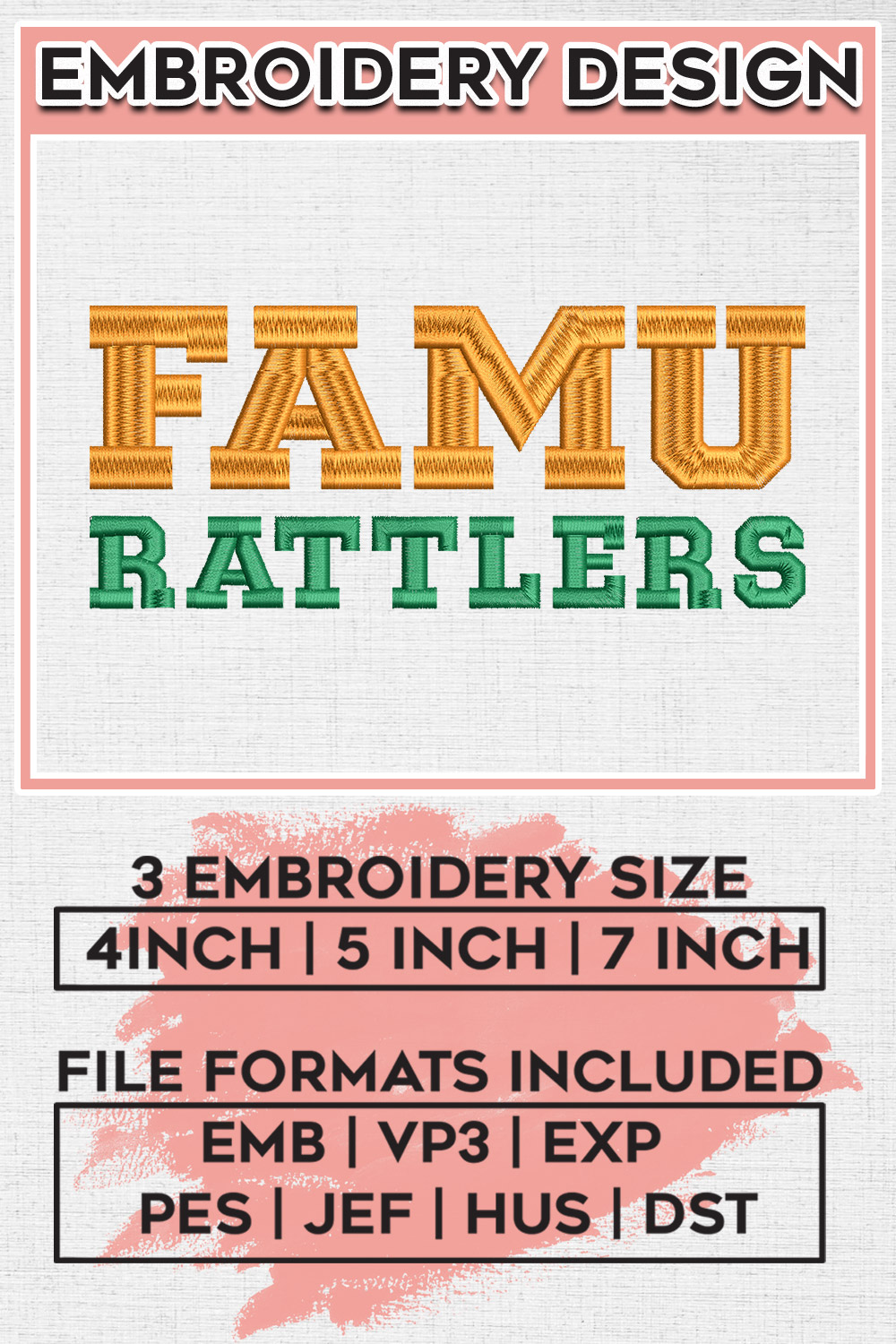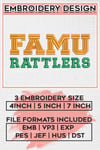 #FAMURattlers #CollegeFootball #EmbroideryDesigns #NCAA #FloridaAM #RattlersLogo #MachineEmbroidery #DigitalDownload #EmbroideryFiles #NCAALogo #FAMU #Rattlers #SportsEmbroidery #CollegeSports #EmbroideryArt #TeamLogo #CustomEmbroidery #SewingPatterns #DIYEmbroidery #RattlersPride