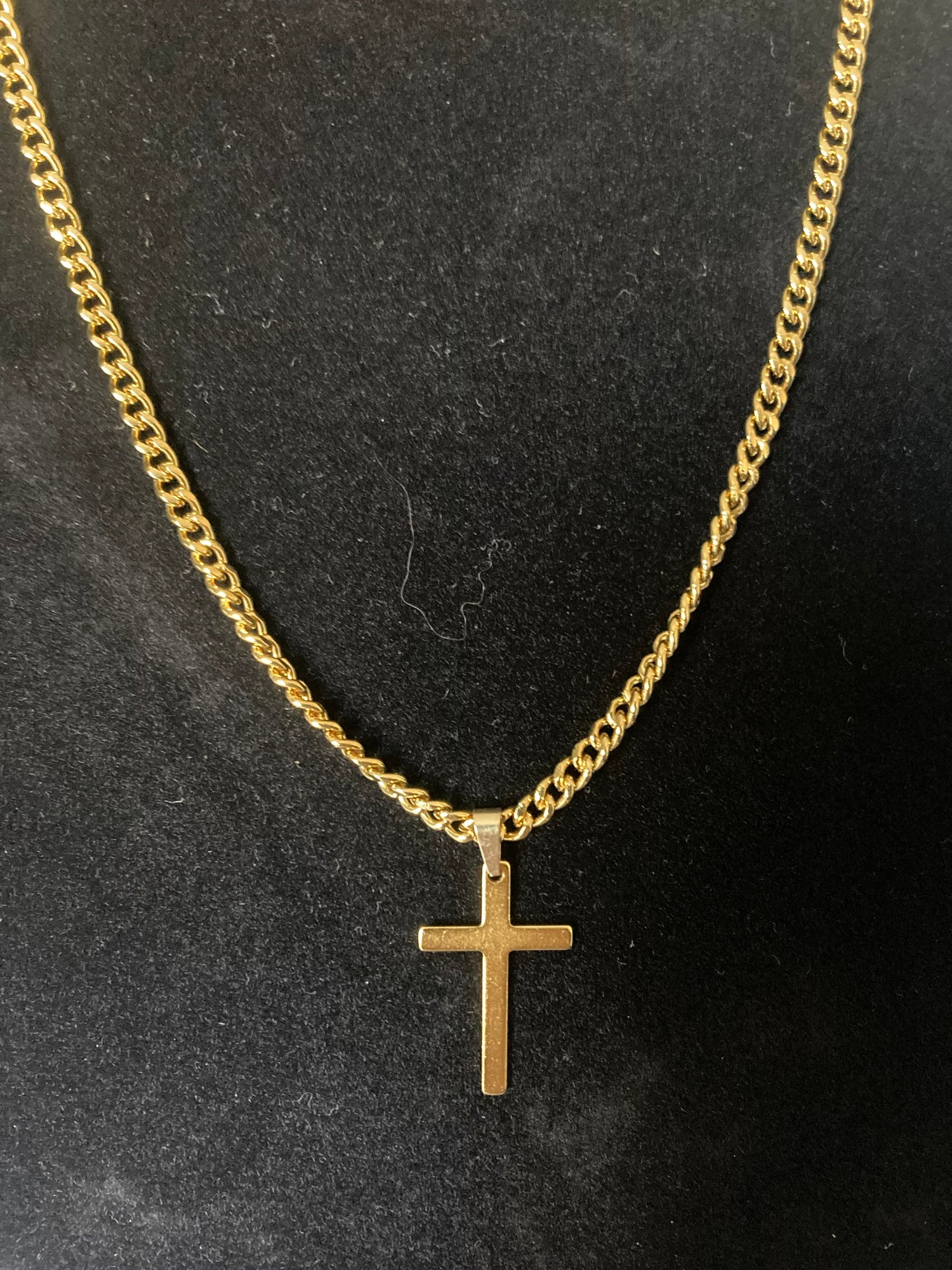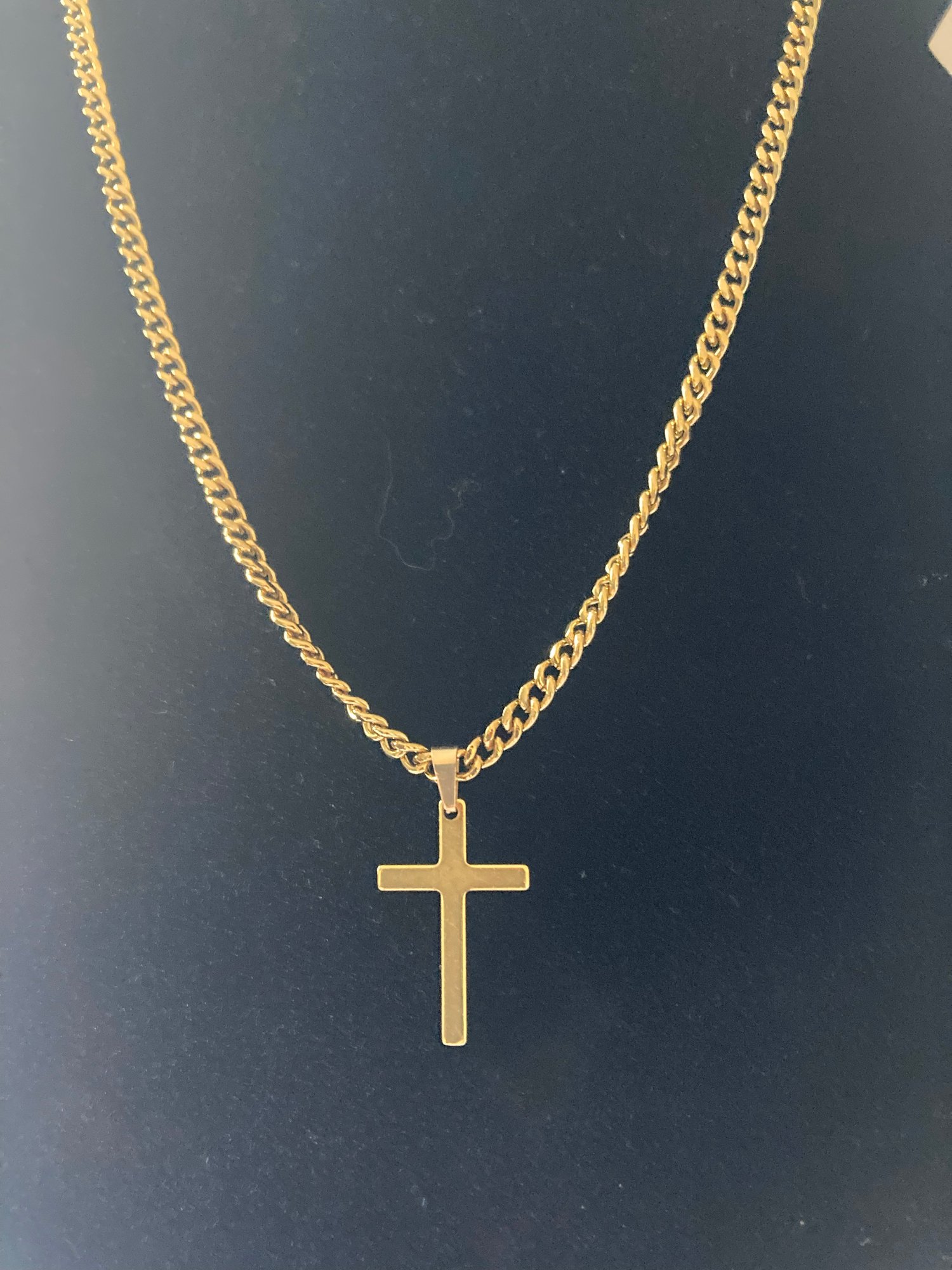 This timeless gold cross necklace blends classic faith symbolism with modern minimalist style. Featuring a sleek gold-tone cross pendant suspended from a durable gold curb chain, this necklace is designed for everyday wear or special occasions. Its clean lines and polished finish make it a meaningful statement of faith while remaining effortlessly stylish.