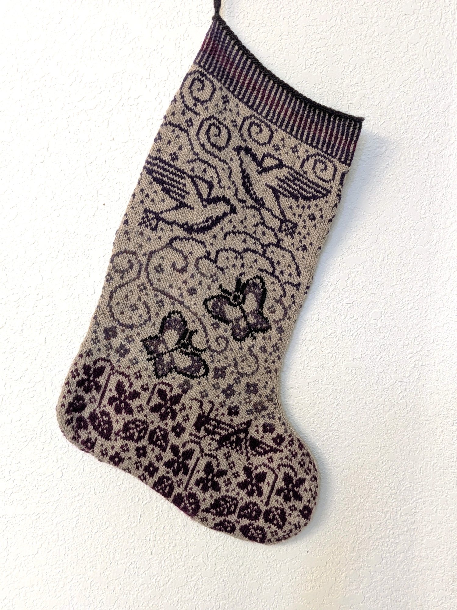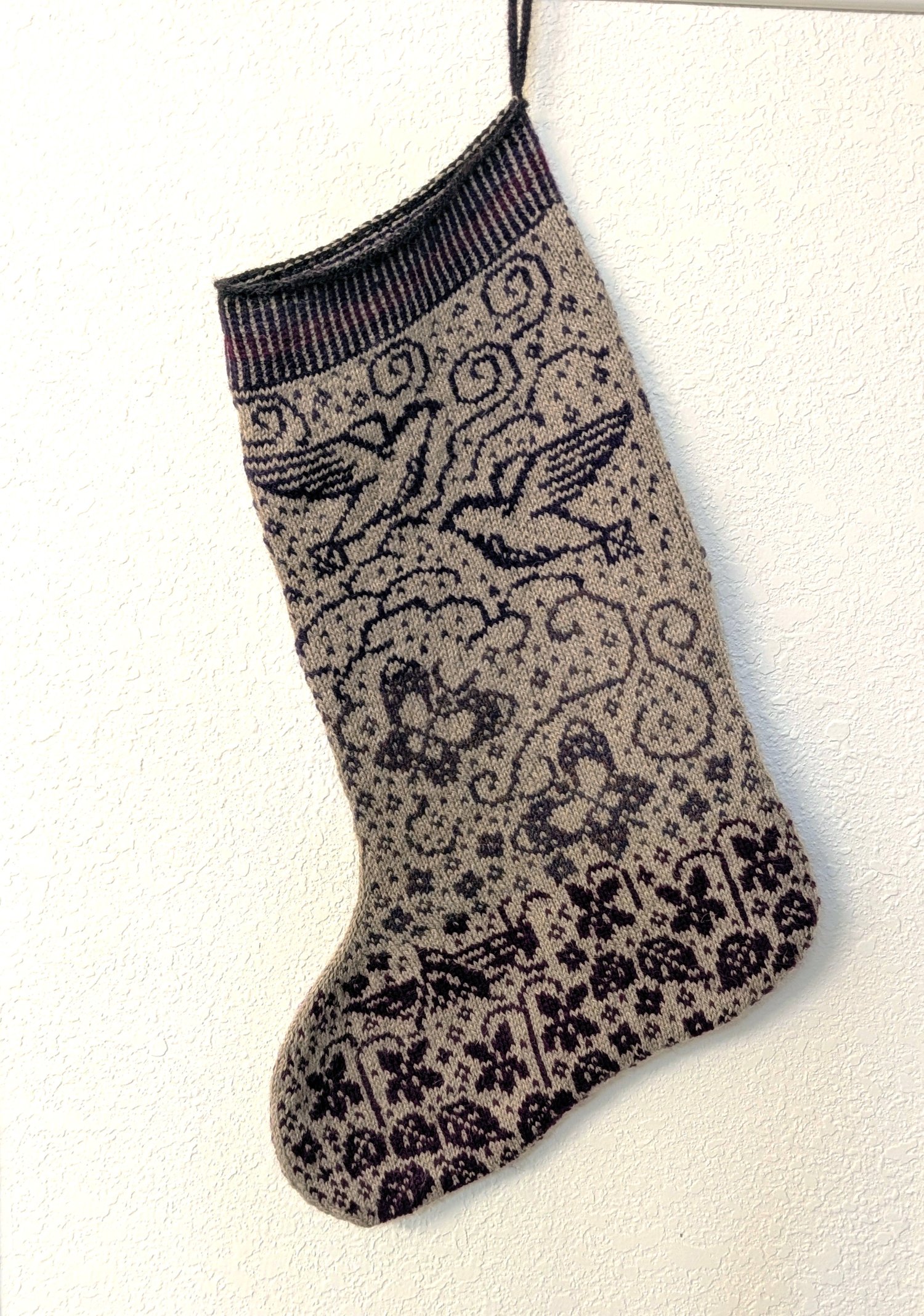 This is a pattern for a decorative stocking using the Stranded colourwork knitting technique and is knit in the round and from the cuff down through most of the foot. Then the piece is worked flat and shaped by binding off stitches and then sewn together.