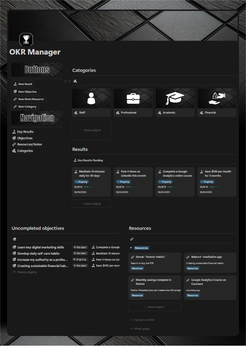 - Resources / Notes: Organize all documentation, links, or materials useful for progressing in each goal.