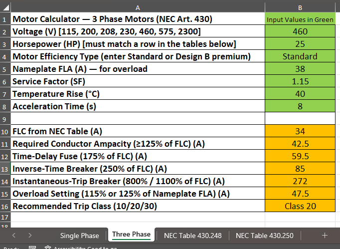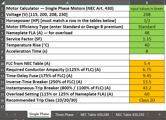 For Use with Microsoft Excel - 2 separate tabs in this sheet that calculates all the ampacities based on the 2026 NEC Article 430 Tables. Sizes required wire ampacity, Motor OLs, and overcurrent protection using Time-Delay fuse, Inverse Time Breaker and Instantaneous Trip Breakers.