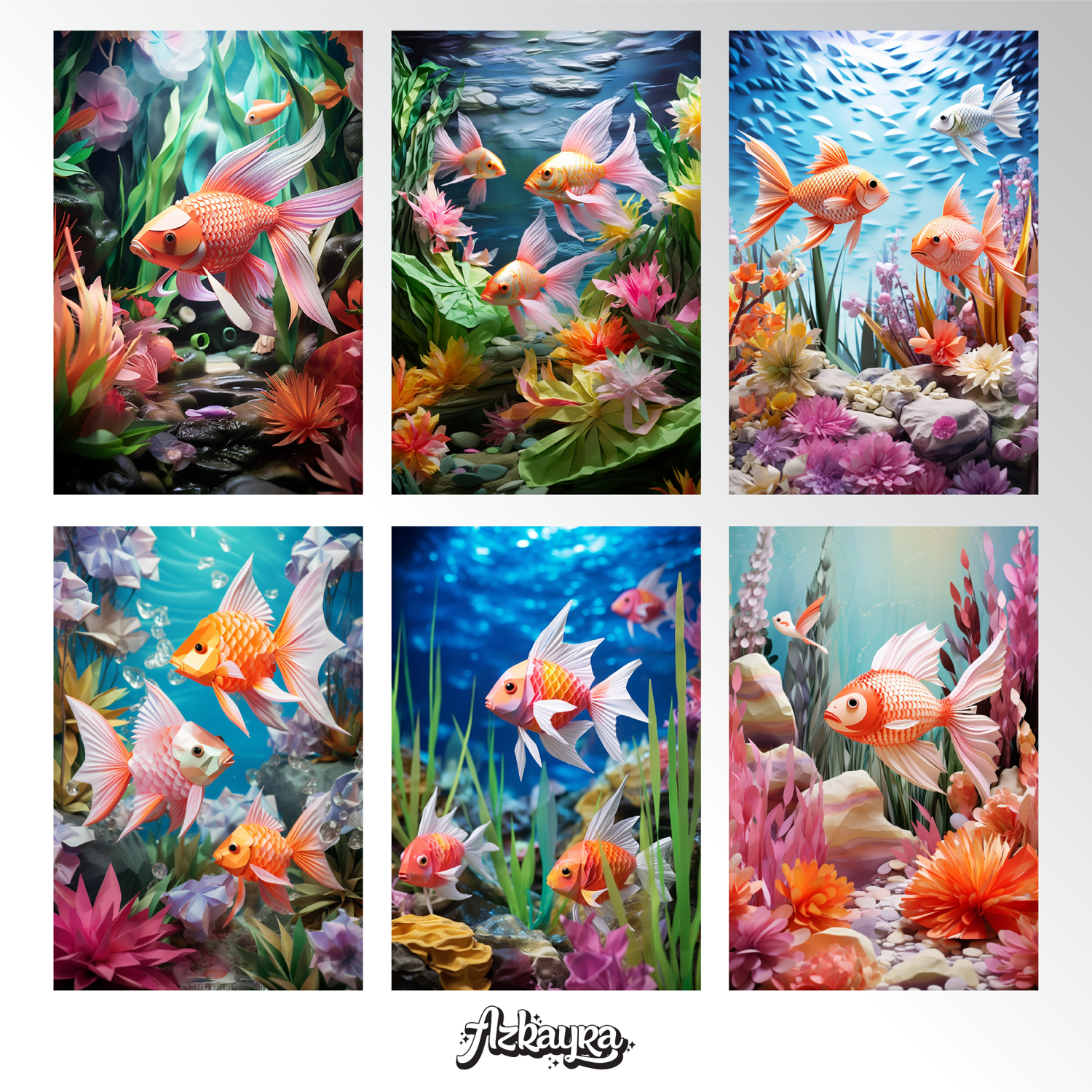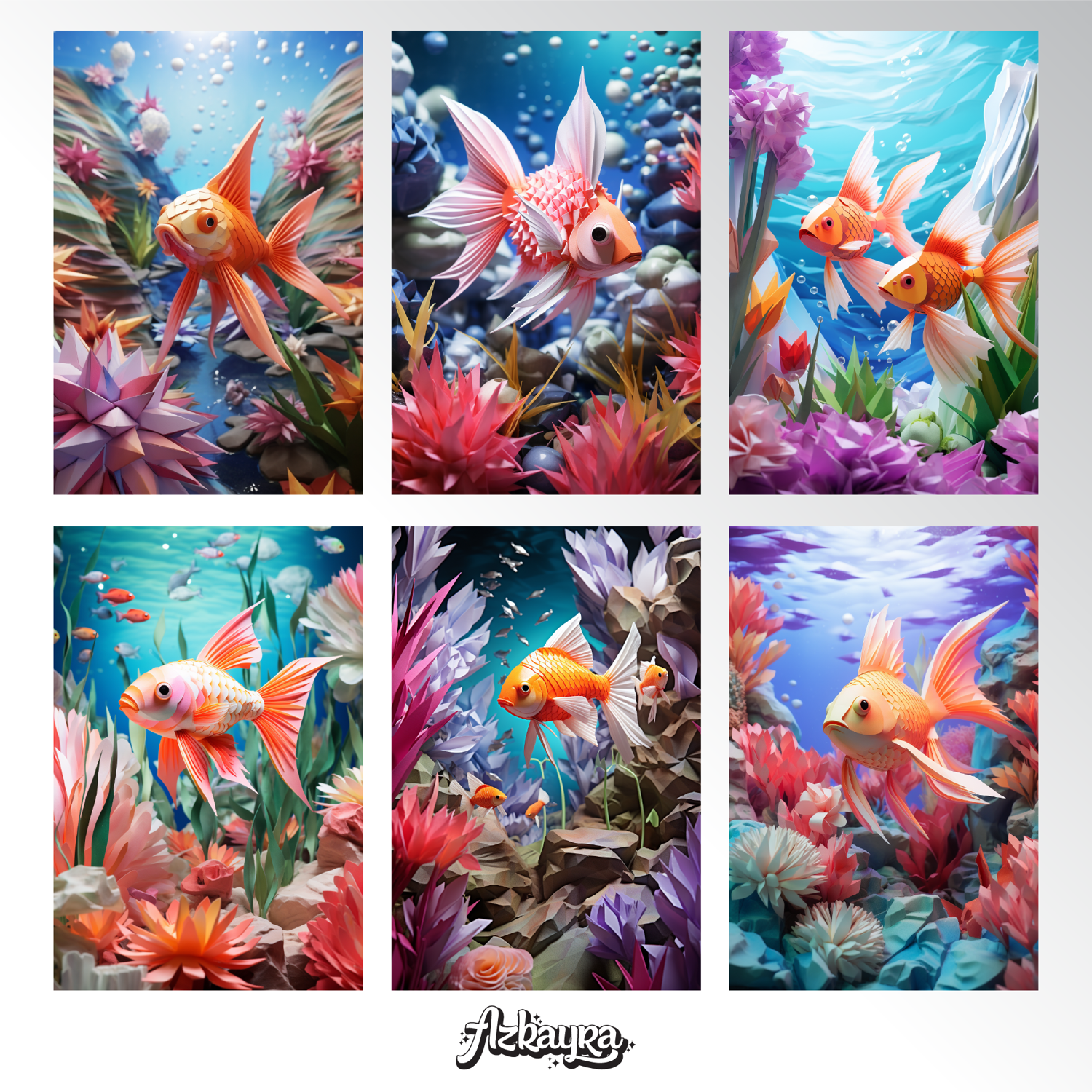 Dive into a world of imagination with our "GoldFish Sticker Design Bundle," featuring over 250 vibrant origami paper art illustrations of enchanting fish in a stunning coral reef backdrop. Each high-resolution PNG design measures 9.3 x 14 inches, perfect for a wide range of creative projects. Let your artistic endeavors flourish as you explore the possibilities of these captivating designs.
