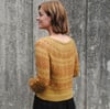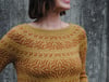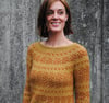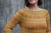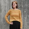 Whispering Fields features horizontal bands of colourwork throughout the garment, with shapes and patterns inspired by fields of wheat moving in a summer breeze.
