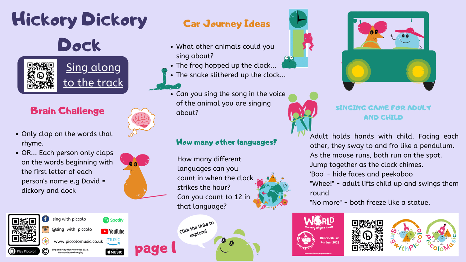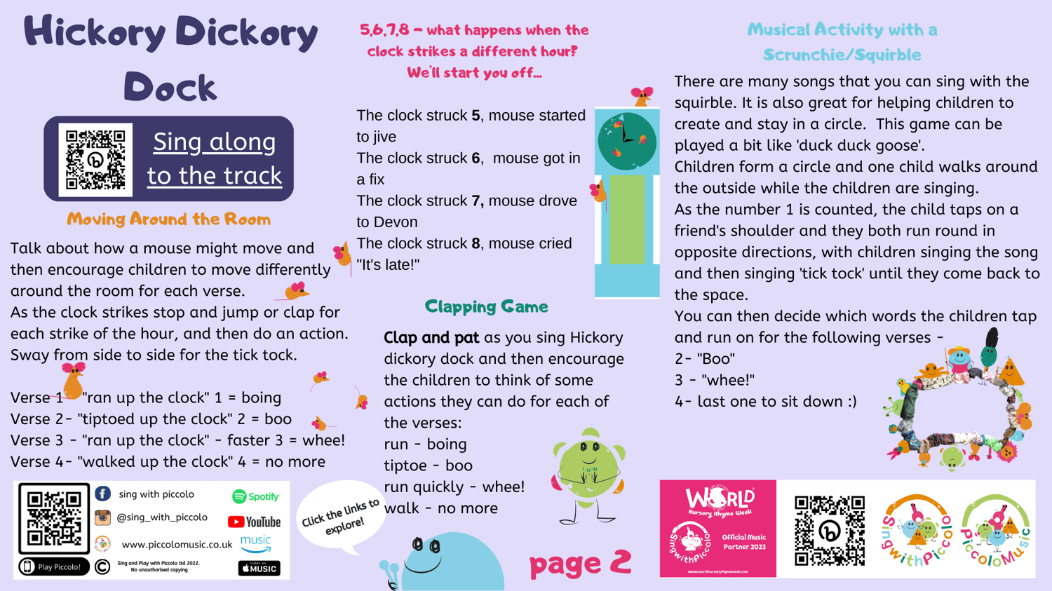Download Piccolo's Musical Activities for 'Hickory Dickory Dock' one of the featured rhymes of World Nursery Rhyme Week 2023. There's so many fun ways you can sing this song! How about as a Knee bouncer? Or with Puppets? Or have a go at Piccolo's 'Sing and Draw' activity! You can find Piccolo's ideas for getting the most fun out of this track in these musical activity sheets!
