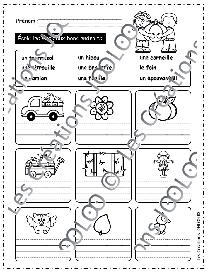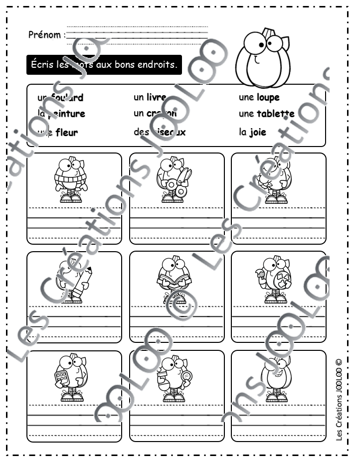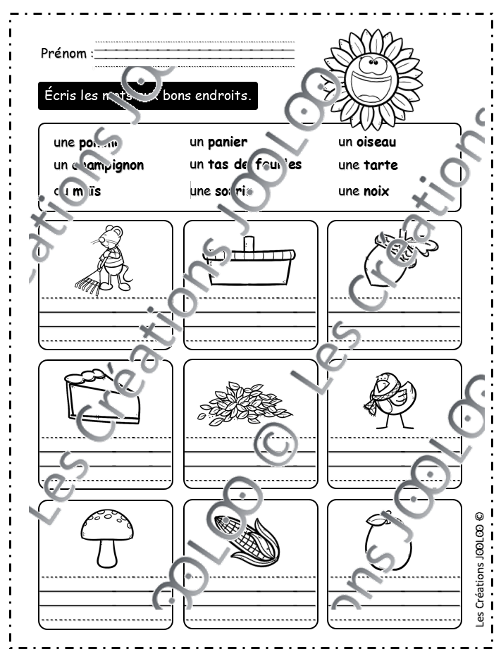 Voici des fiches pour les élèves du 1er cycle afin de travailler l'orthographe de mots. L'élève devra écrire les mots aux bons endroits sous les images appropriées.