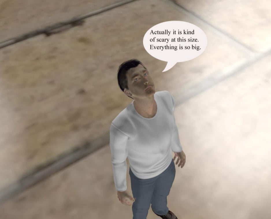 As he walked briskly through the bustling corridors, Isaac suddenly felt a strange sensation wash over his body. It started as a tingling, then escalated into a dizzying, lightheaded feeling. In a matter of seconds, the world around him began to rapidly expand at an alarming rate. The walls, floors, racks of clothes, and even people grew larger and larger, towering over him as he shrunk down to the size of a helpless cockroach scurrying on the tile. "What the hell is happening to me?" Isaac cried out in sheer terror as he found himself miniaturized, now vulnerable and insignificant amidst the giant mall. His panicked voice was no louder than an ant's squeak to the regular-sized patrons passing him by.