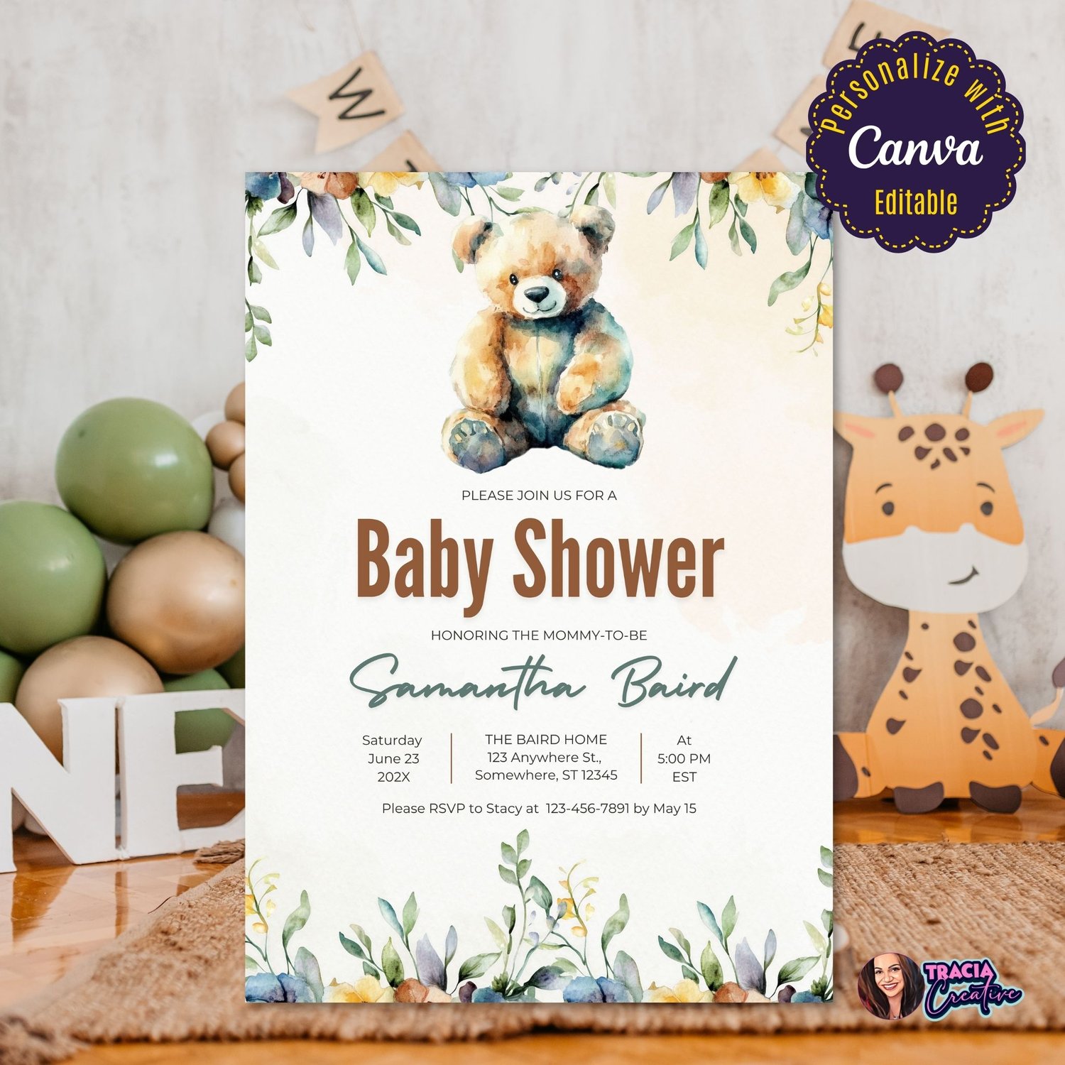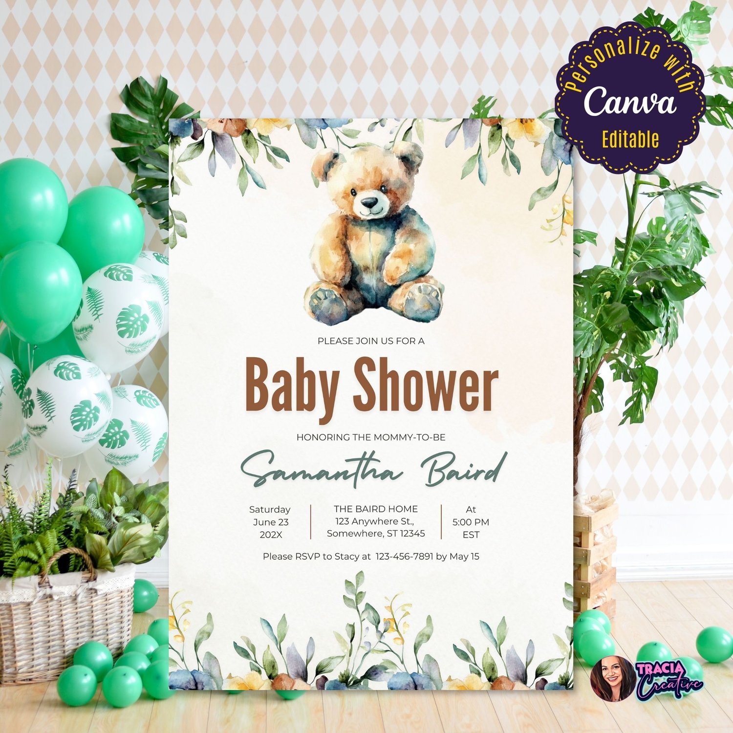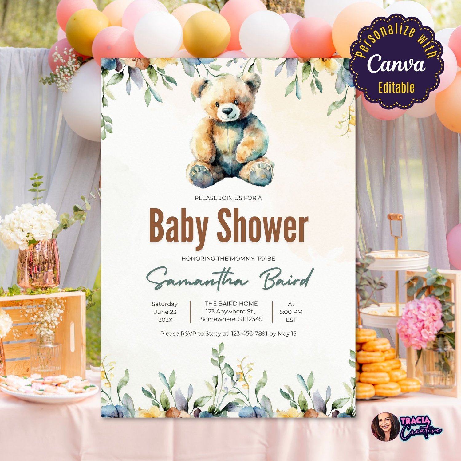 Boho Teddy Bear Baby Shower Invitation | Editable Canva Template | Party Printable | Instant Digital Download