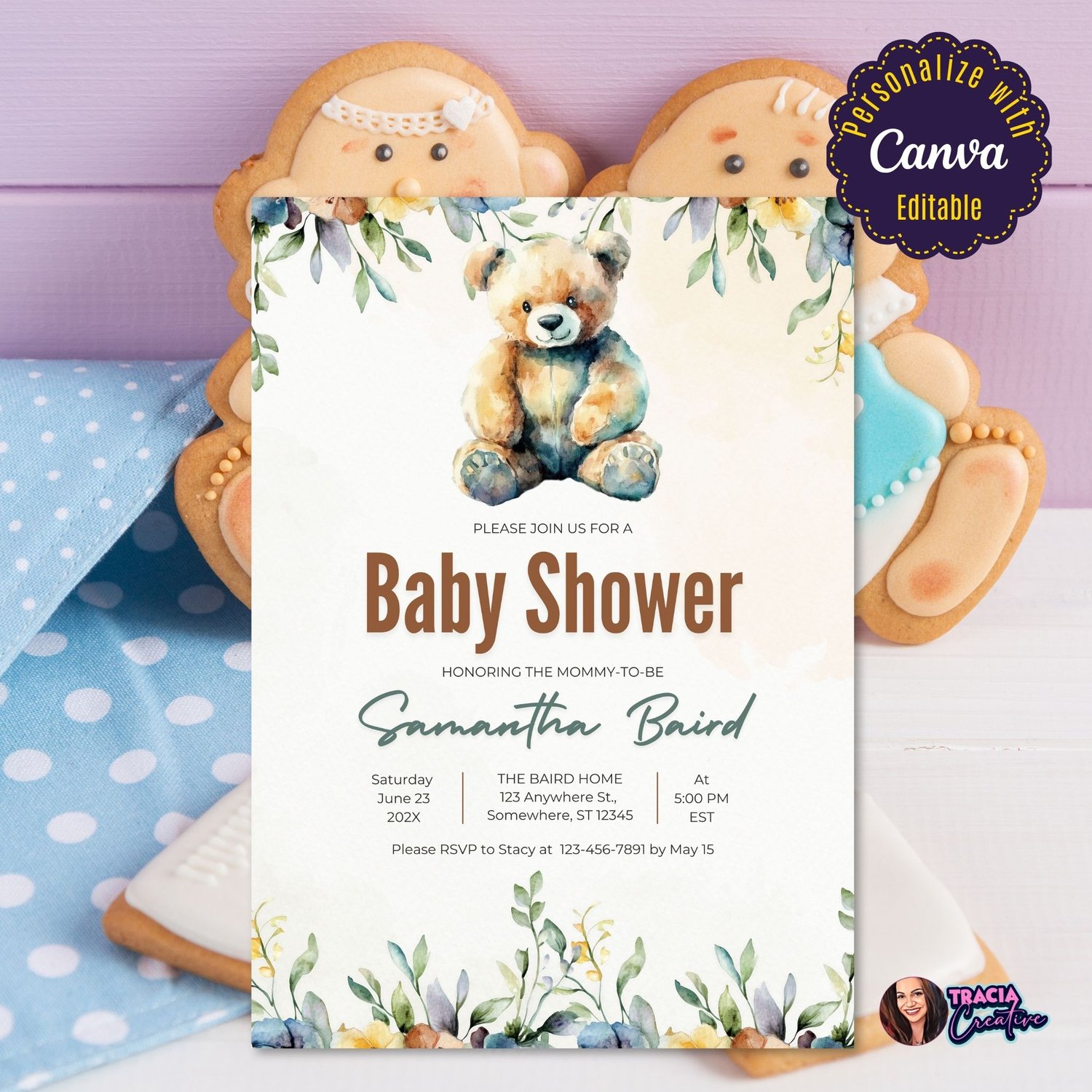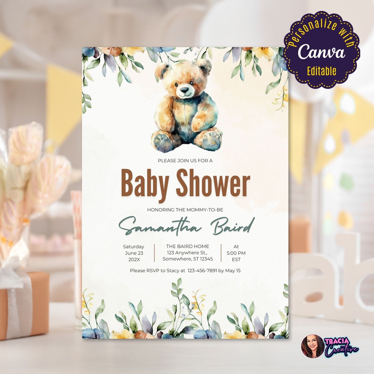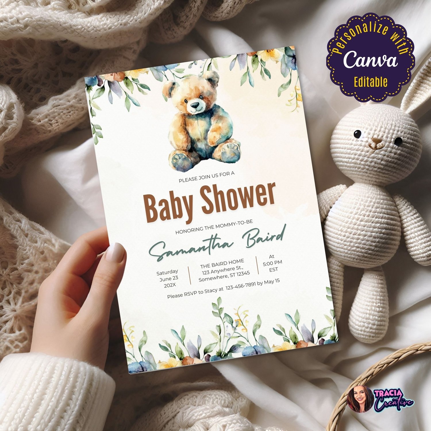 Boho Teddy Bear Baby Shower Invitation | Editable Canva Template | Party Printable | Instant Digital Download