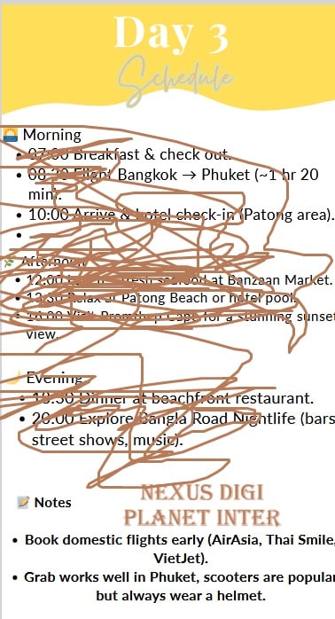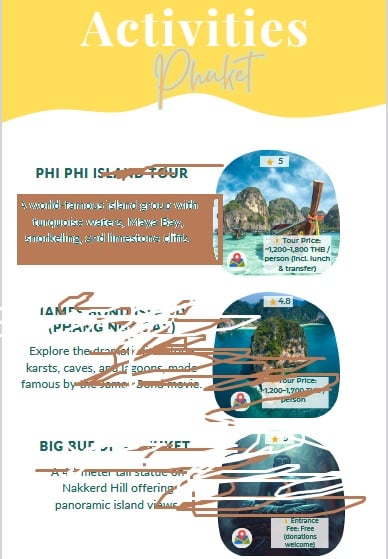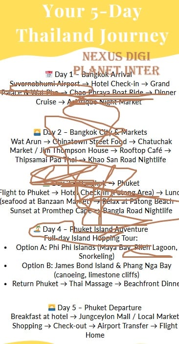- Day-by-Day Itinerary (Bangkok + Phuket) → with morning, afternoon & evening activities