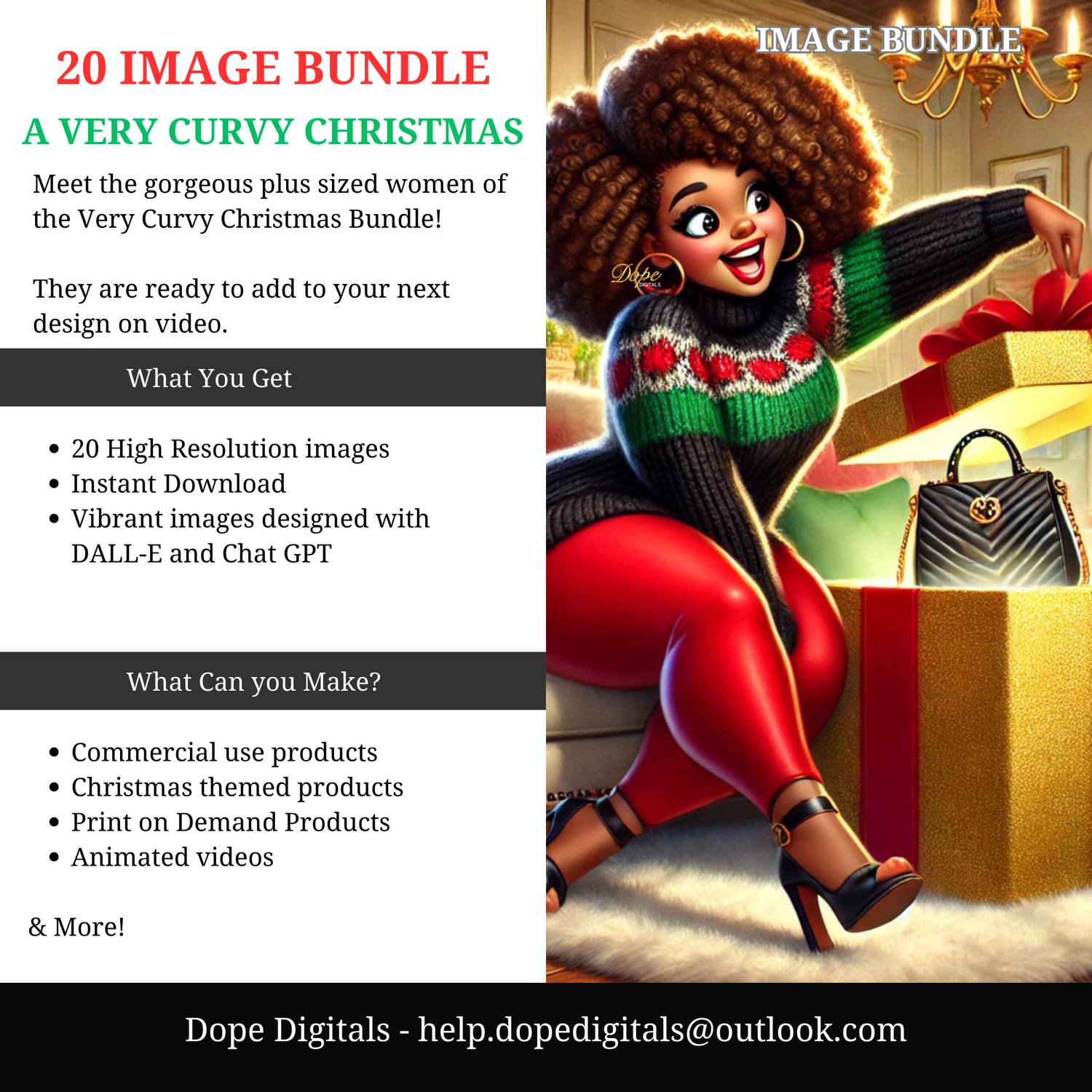 Plus size Christmas images, curvy Christmas bundle, AI holiday art, plus size clipart, festive AI images, curvy women holiday graphics, Christmas AI bundle, holiday print on demand art, African American Christmas images, body positive holiday art.