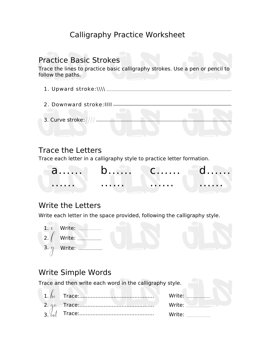 - Target Skills: Developing calligraphy skills through stroke practice, letter formation, and writing simple words in a calligraphic style.