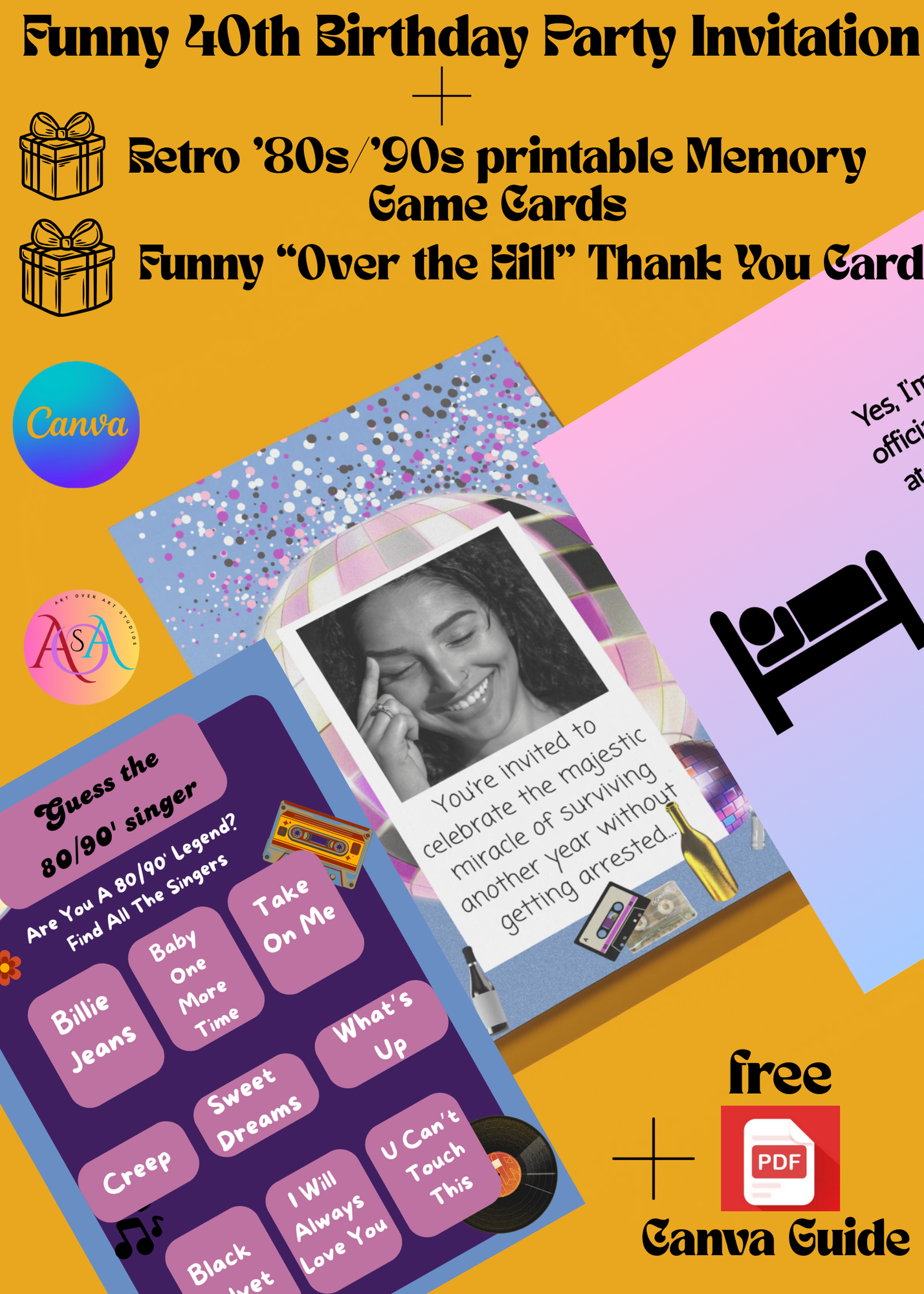 Retro Canva 40th Birthday Invite Bundle | Funny 40th Birthday Party Invitation + Guess the 80/90s Singer Game + Printable Thank You Card + PDF Guide