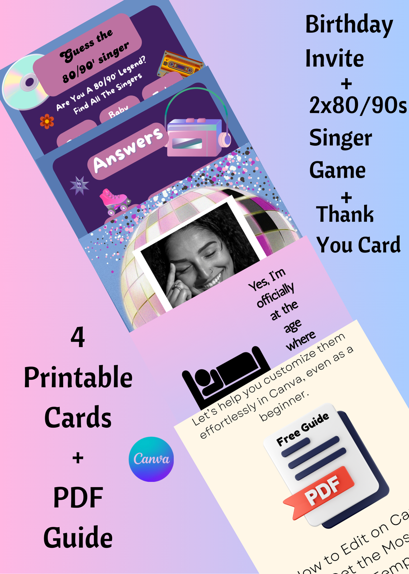 This Retro 40th Birthday Canva Set is your instant party starter—packed with a disco-themed invitation (fully editable), two 80s/90s "Guess the Singer" printable game cards, a witty thank-you card, and a bonus “How to Edit on Canva” PDF guide.
