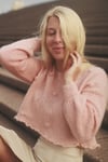 Telopea is a cropped mohair sweater with a rounded neckline, frilly bottom hem, slightly puffed sleeves, decorative textural cuffs and embroidered roses all around the body.