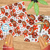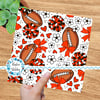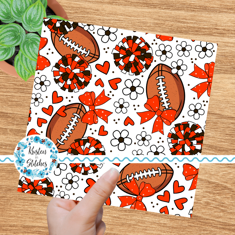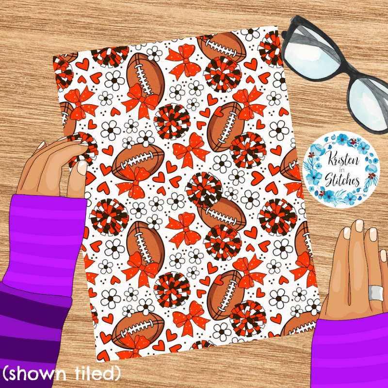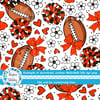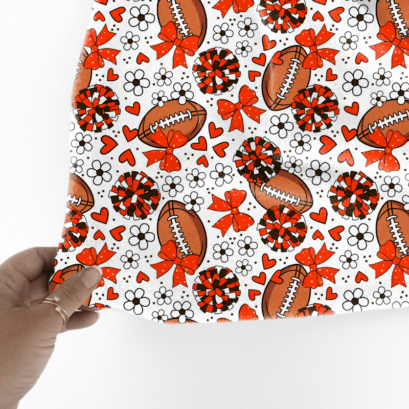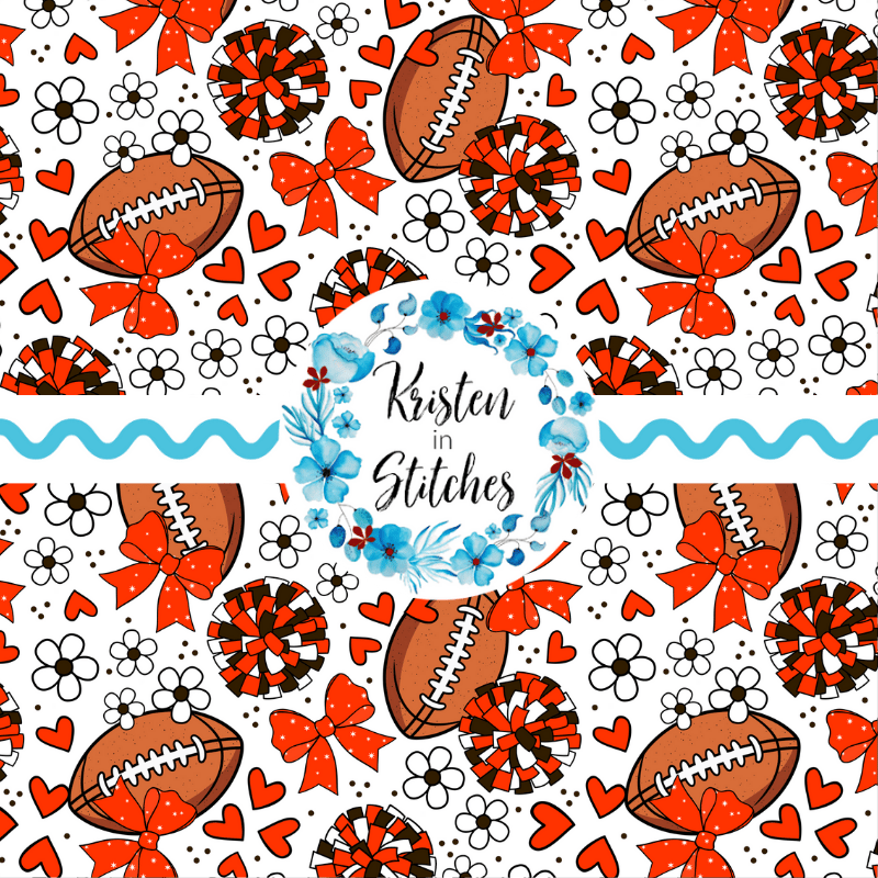 Floral pattern with daisy flowers, cheerleader bows, pompoms, footballs and hearts.