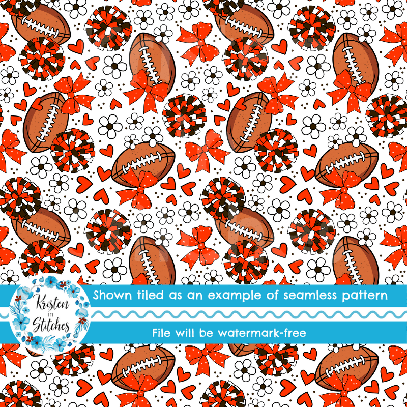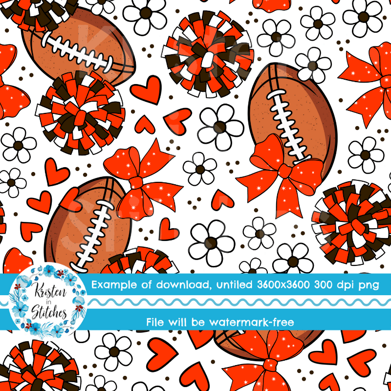 Football Cheer Bows and Pom Poms Seamless Pattern, Cleveland Browns Orange Brown