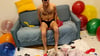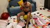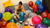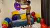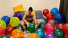He squeeze pop them with his hands, foot pop them, pin pop them, and try sit pop but use his hands to finish the balloons while sitting on them.