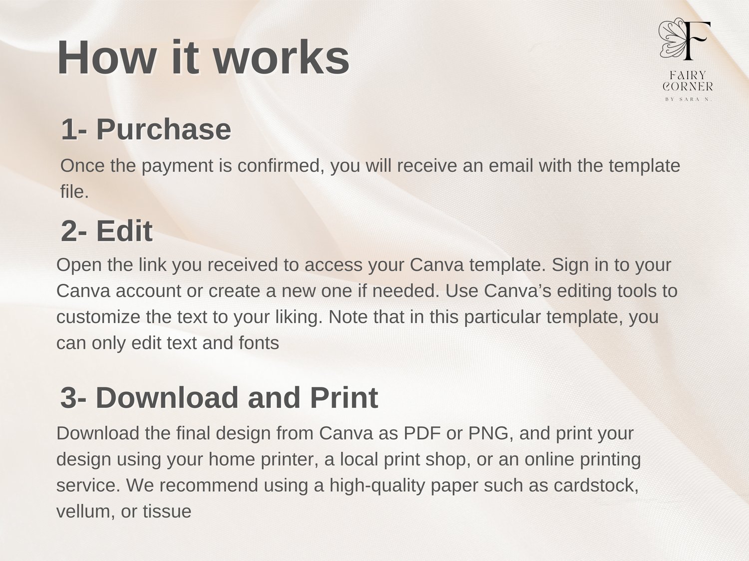 ✨Edit: Open the link you received to access your Canva template. Sign in to your Canva account or create a new one if needed. Use Canvas editing tools to customize the text to your liking. NOTE that in this particular template, you can only edit text and fonts