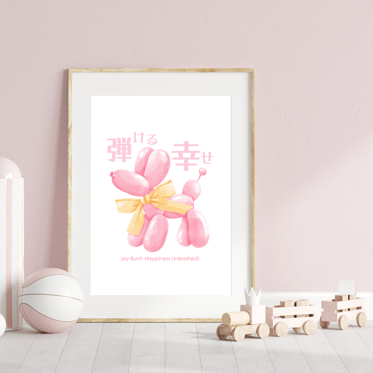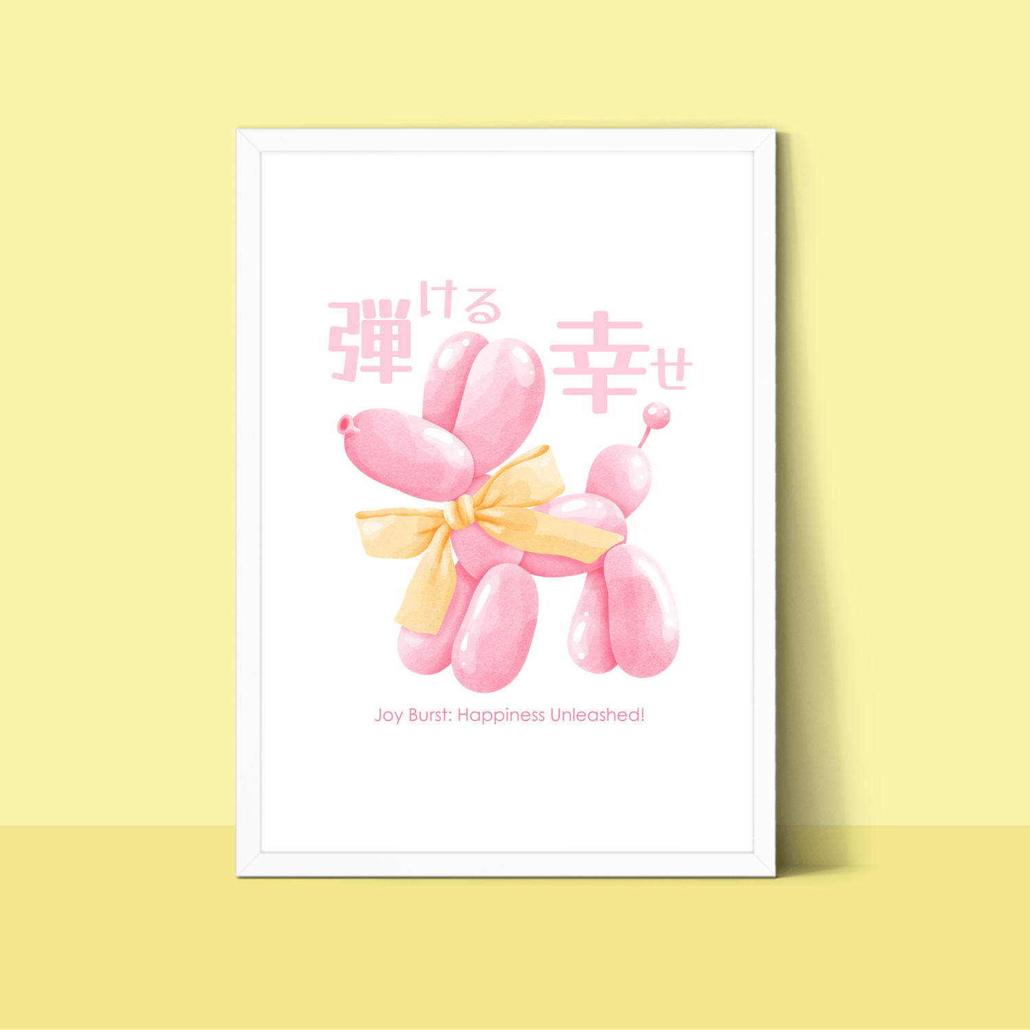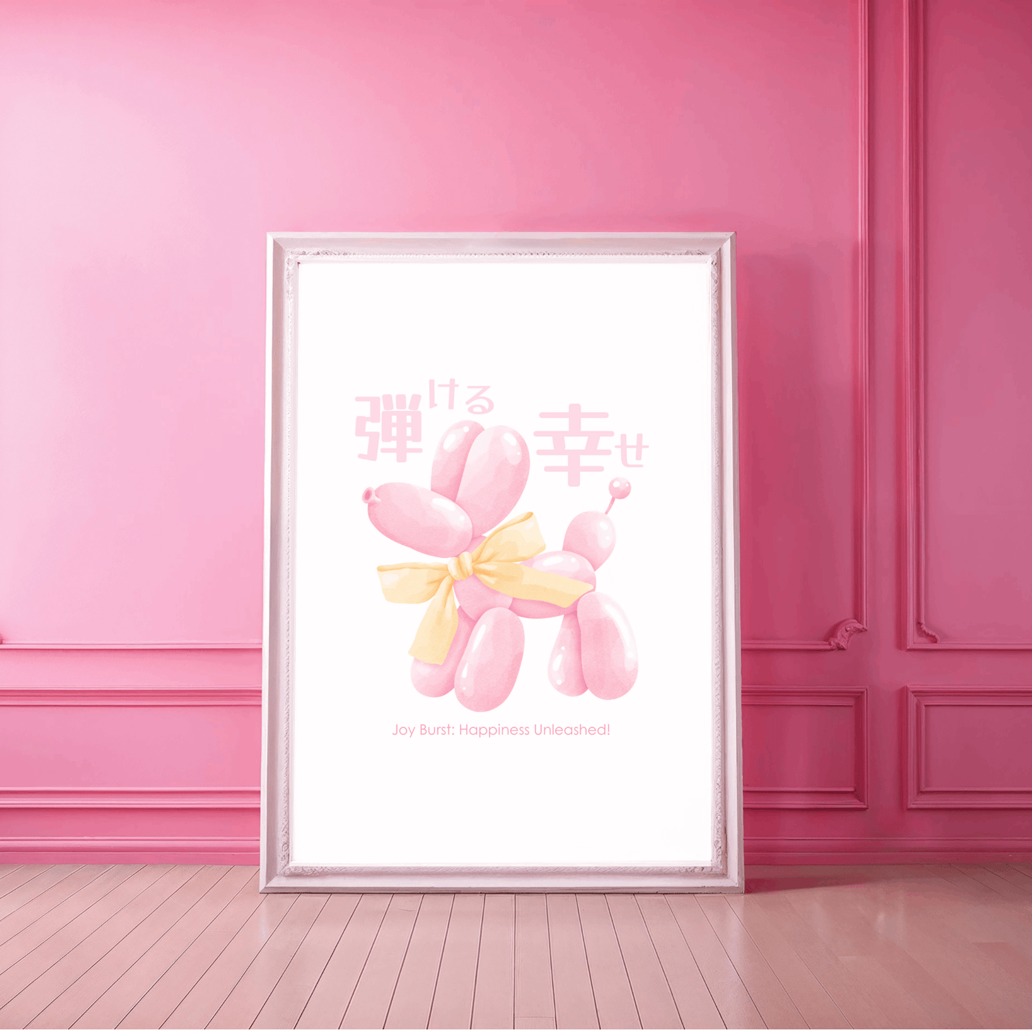 My balloon dog wall art brings a burst of cheerful pink to any room. This adorable poster features a playful pink balloon dog, accompanied by a joyful Japanese quote meaning "bursting with happiness." Printed on high-quality material, it's designed to catch the eye and lift the spirits.