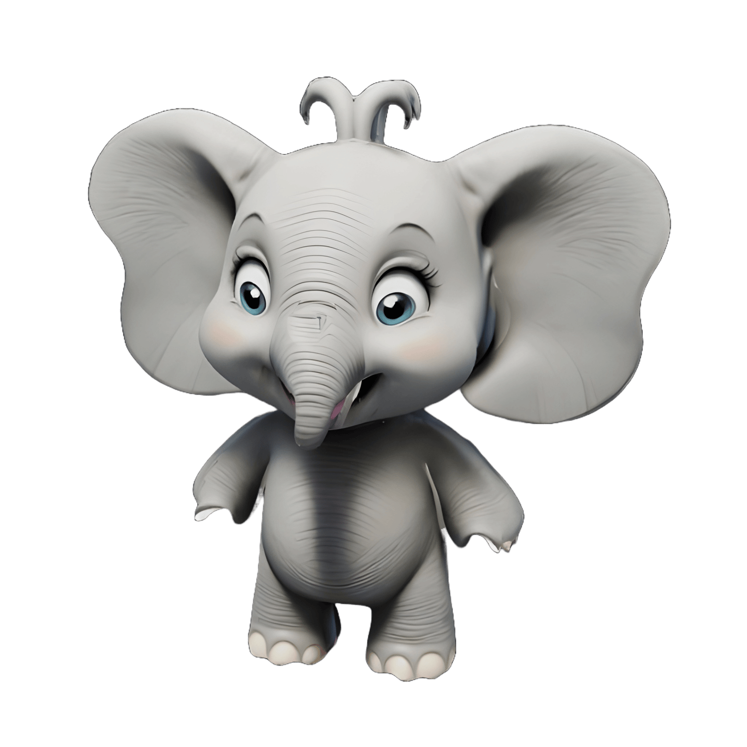 - Image 2 presents a cartoonish elephant with exaggerated features, blue eyes, and a playful tuft of hair - great for toys or children's room décor