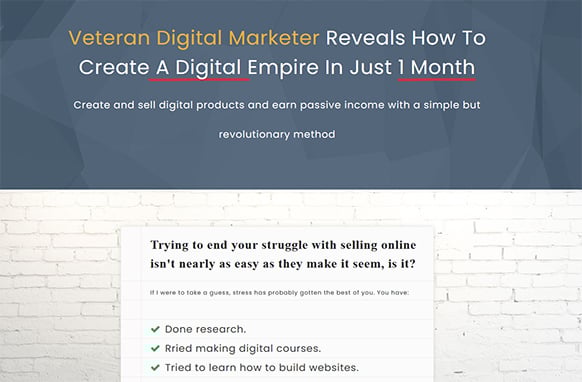 Veteran Digital Marketer Reveals How To Create A Digital Empire In Just 1 Month. Create and sell digital products and earn passive income with a simple but revolutionary method Trying to end your struggle with selling online isn't nearly as easy as they make it seem, is it?