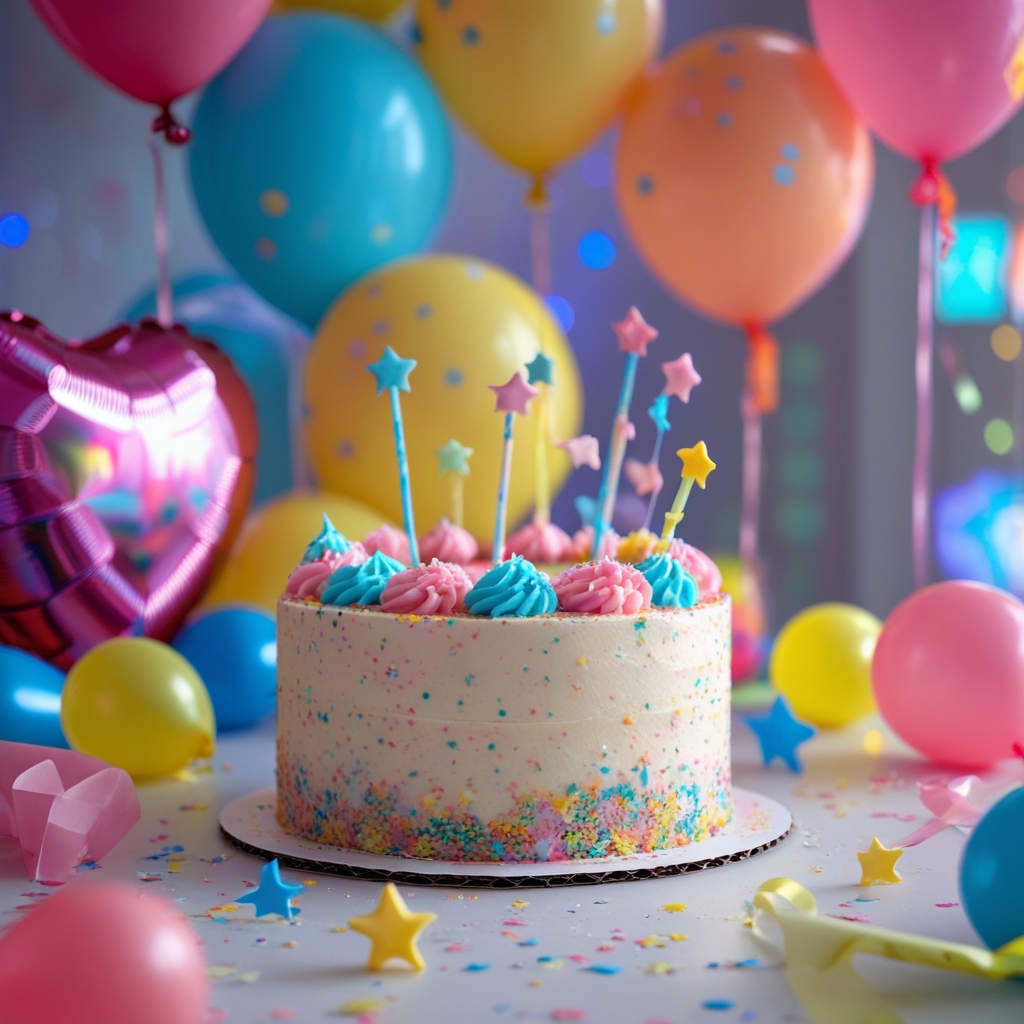 A vibrant confetti cake sits at the center of a festive party atmosphere, adorned with pastel frosting in soft shades of pink, blue, and yellow, and sprinkled with edible glitter that catches the light, surrounded by balloons in various bright colors and shapes, including round, heart-shaped, and star-shaped, with additional decorations of twinkling star-shaped sprinkles and delicate frosting designs, the overall scene exuding a joyful and celebratory ambiance with a few confetti pieces scattered around the cake and a faint glow of colorful lights in the background, filling the space with an infectious energy and warmth.