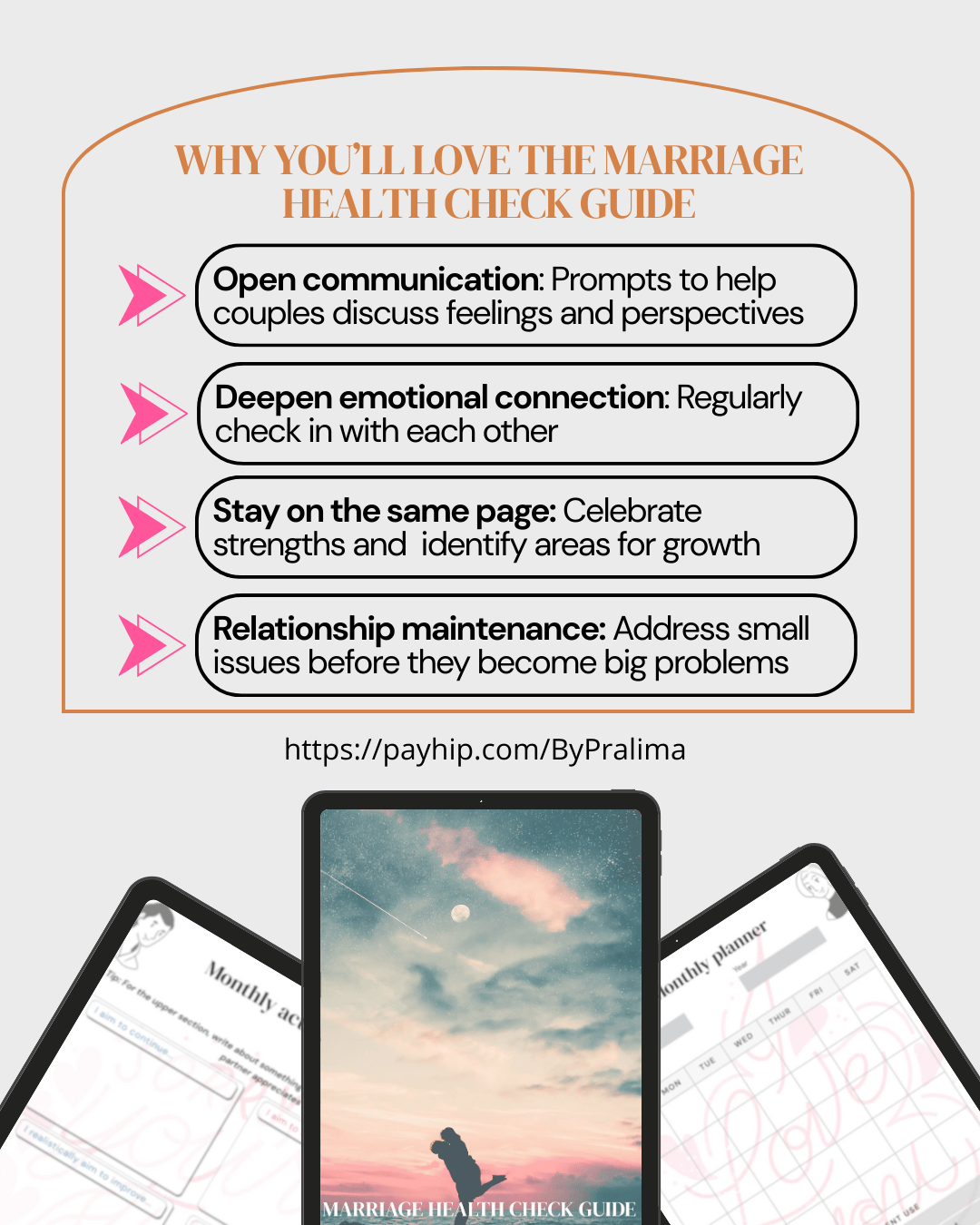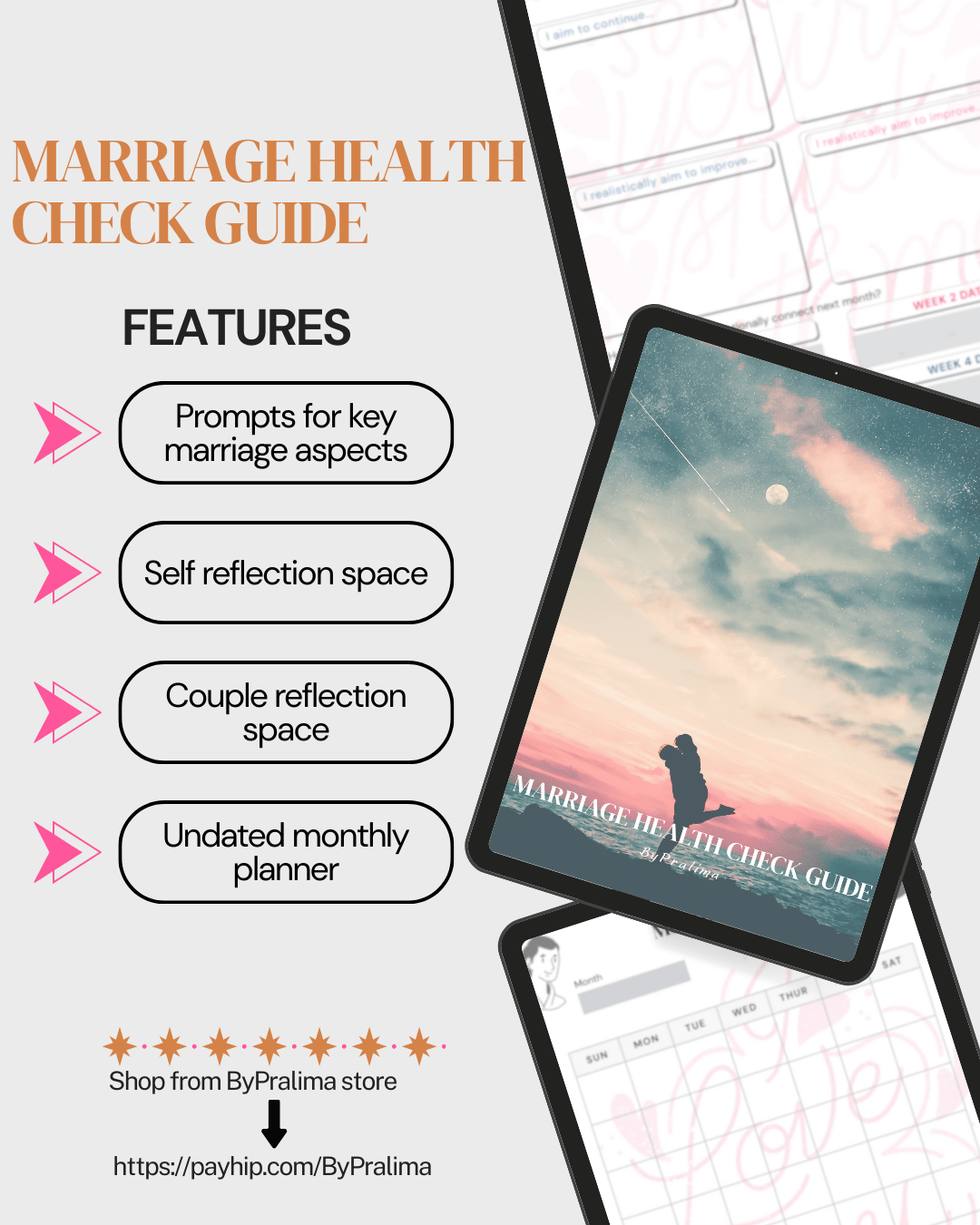 Looking to keep the spark alive and strengthen your bond? This thoughtfully designed 10-page resource Marriage Health Check Guide is for you to help you maintain a healthy relationship with practical tools, guided prompts, and a monthly planner to keep you both on the same page.