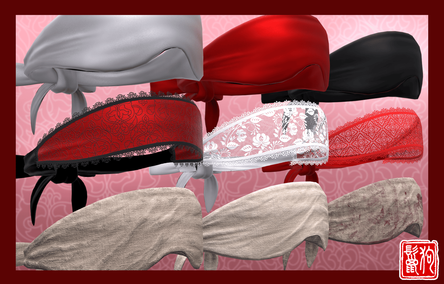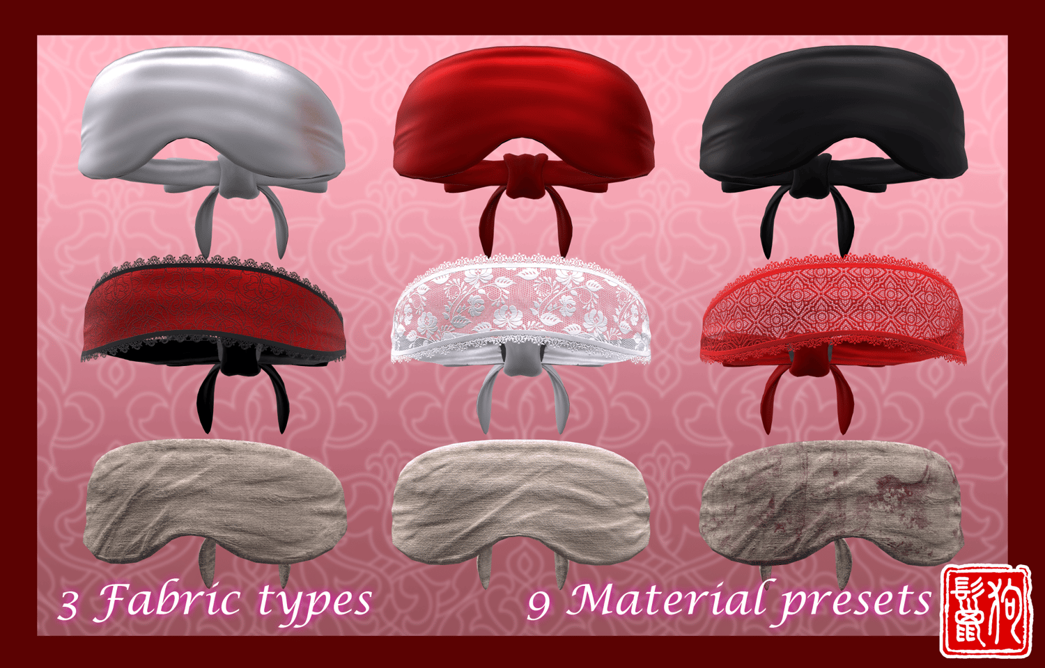 - The Normal fabric blindfold (Silk and Bandages) and the Lace blindfold share the exact same mesh, but the texturing style is a bit different so both of them have their own separate prefabs with their own adjustments.