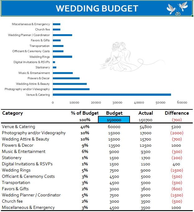 - The “Wedding Budget template” includes: