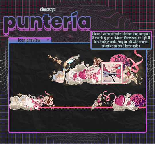 A Valentine's Day icon template & matching post divider. There's no blockquotes, but it should be wide enough to cover the post width. The image used in the preview is not included with the psd file. Easy to edit if you're familiar with the following: layer styles, shapes, selective color and layer masks.