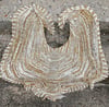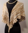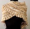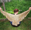 This handknit shawl, constructed in the winged style, is modelled after a barn owl in flight. Sizing is 22” deep with a 54” wingspan.