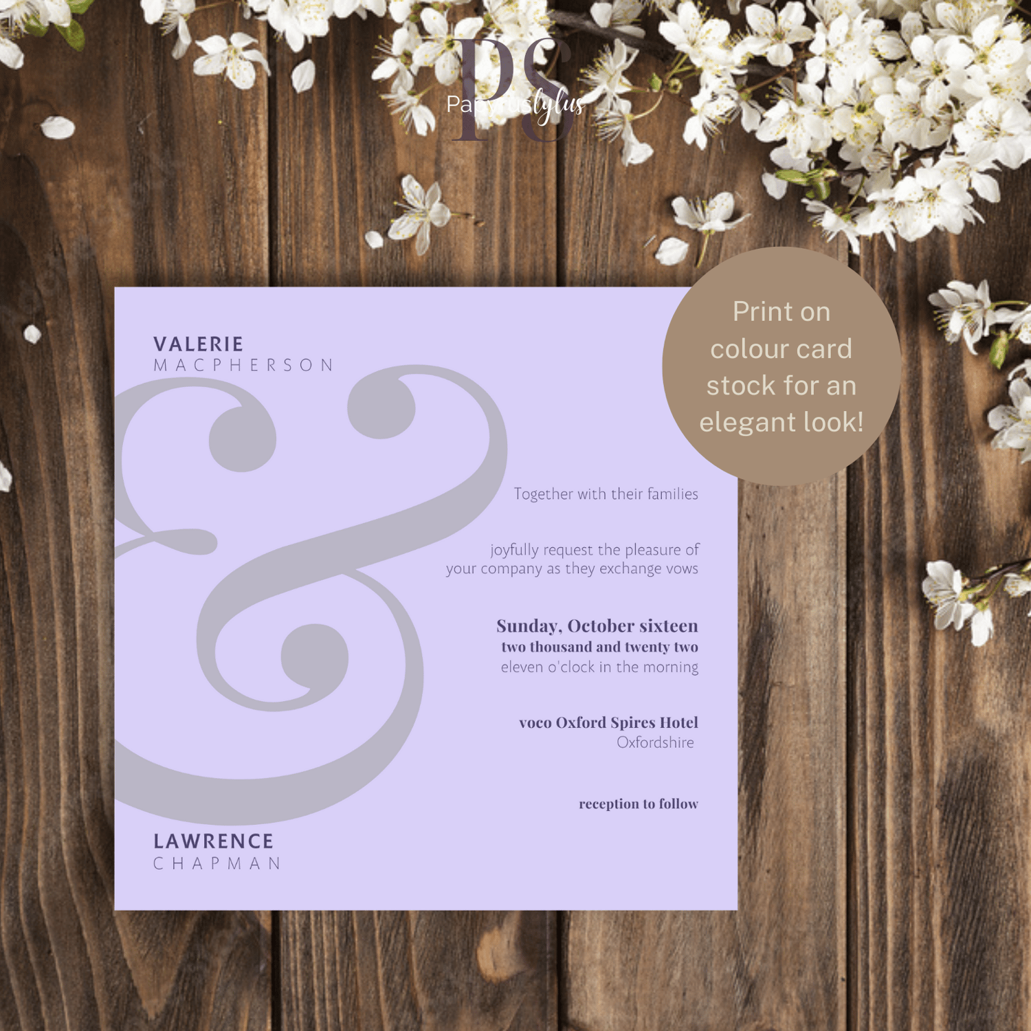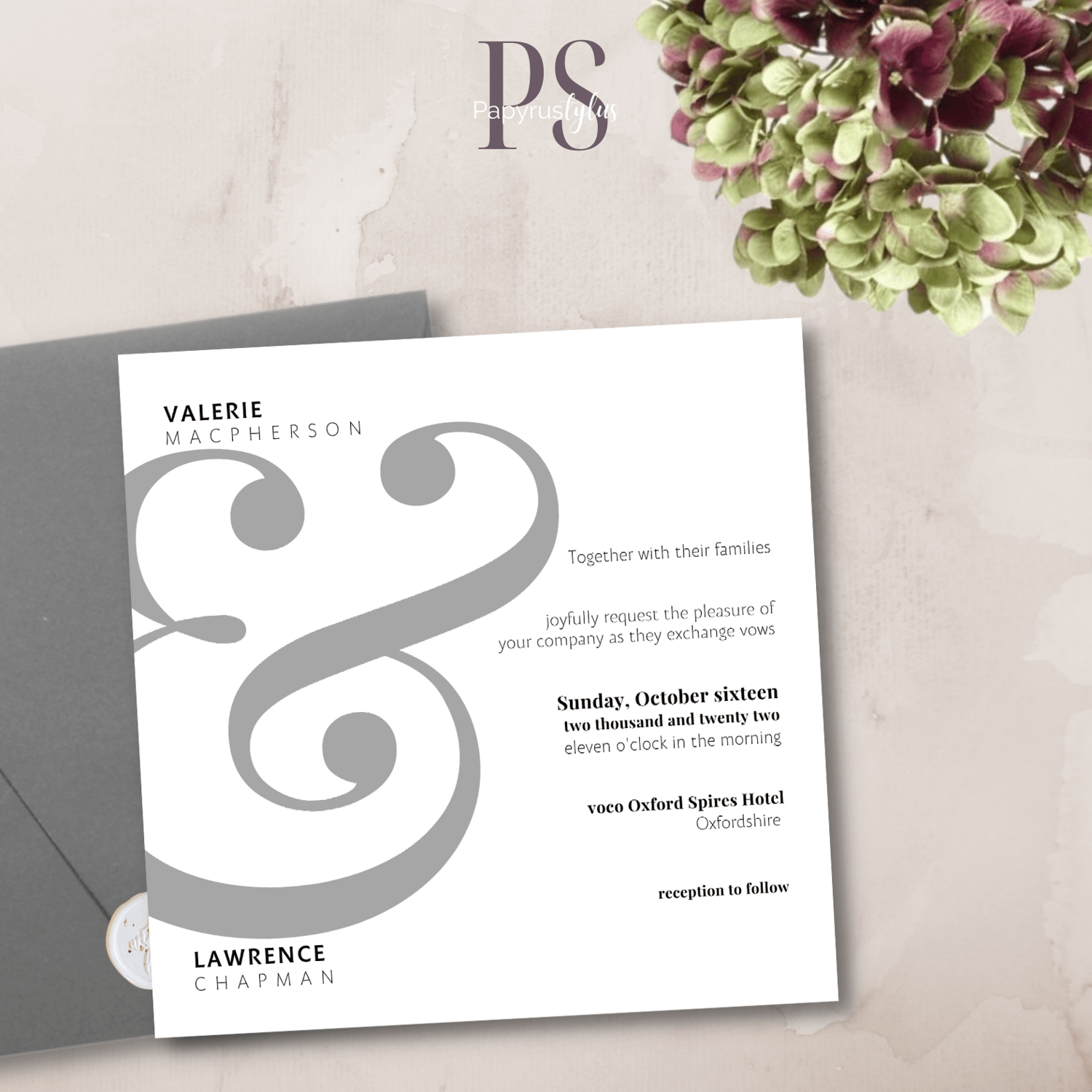 This invitation features a huge "&" that connects the names of the wedding couples.