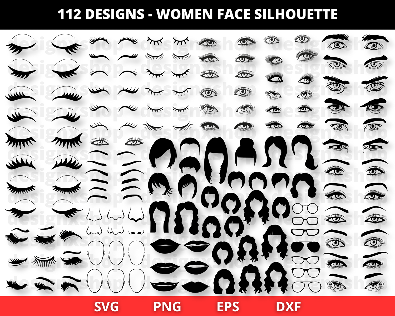 Woman face svg, eyelash svg, lashes svg, hair svg, woman svg, female svg, women svg bundle, Hair Lips Nose Eyes Eyebrows Designs Set