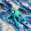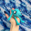 An amigurumi fish plushie with posable arms and legs.