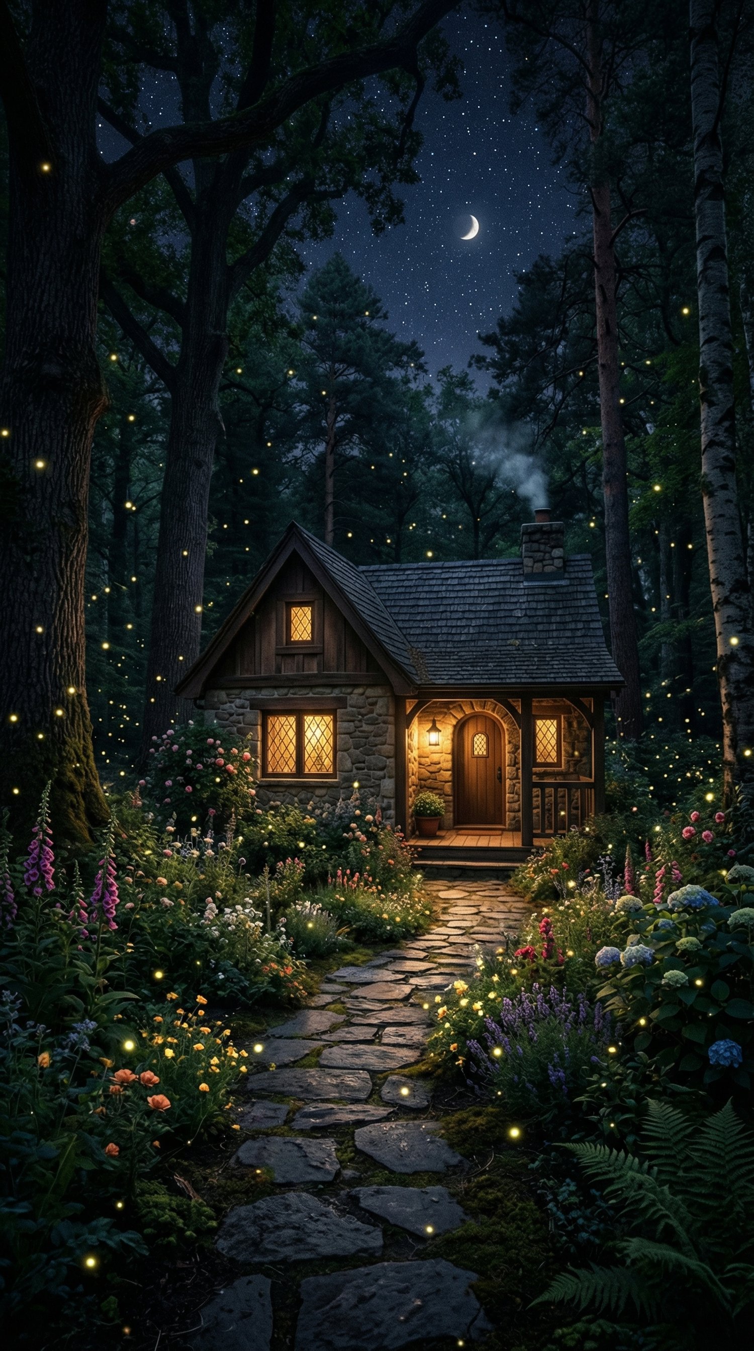 Step into a magical woodland scene with a charming storybook house nestled among towering trees. Surrounded by blooming flowers and a winding stone path, the cottage glows softly under a single ray of light, while fireflies dance in the night air. This cinematic composition captures a serene and whimsical atmosphere, perfect for creators seeking cozy, detailed, and visually enchanting imagery that feels straight out of a fairy tale.