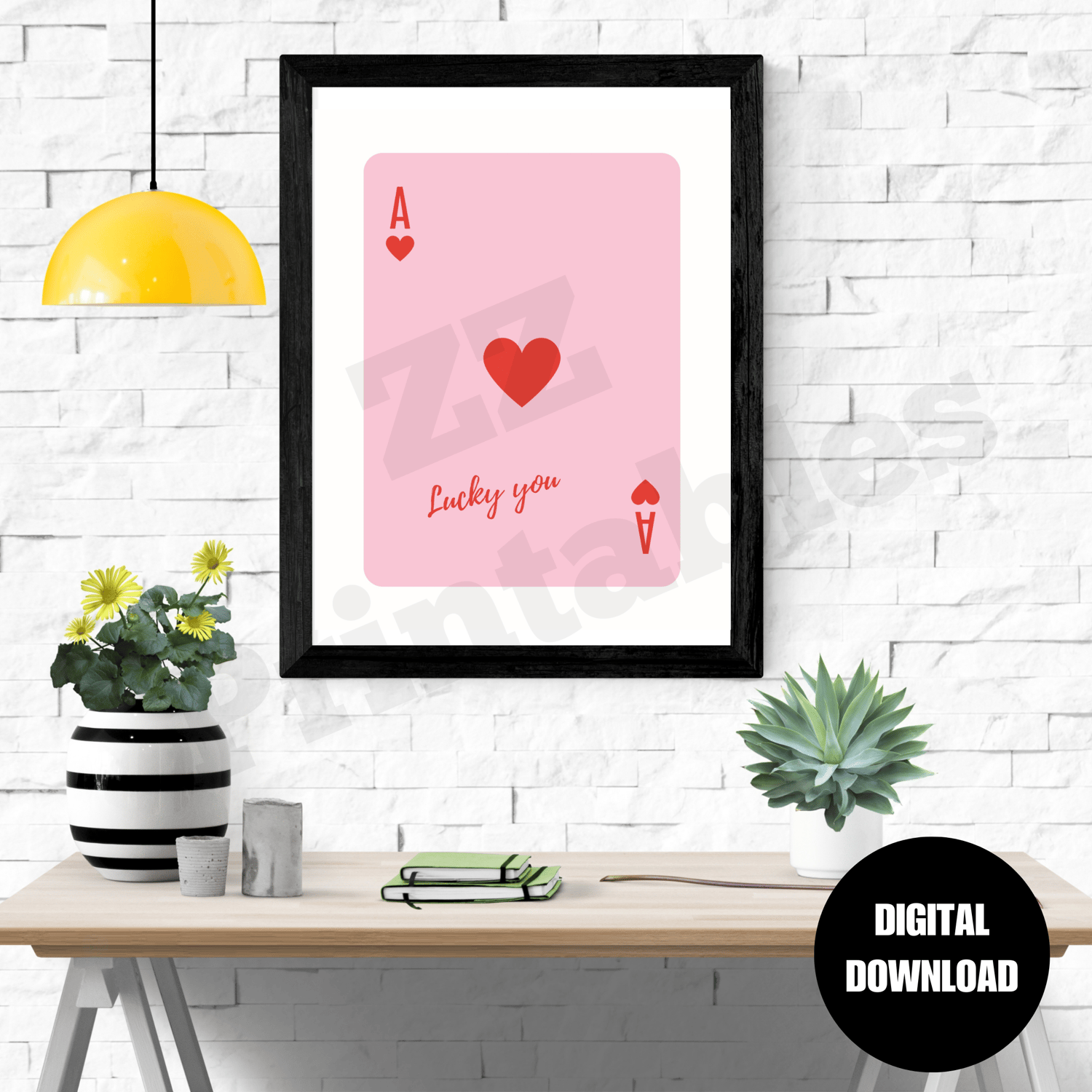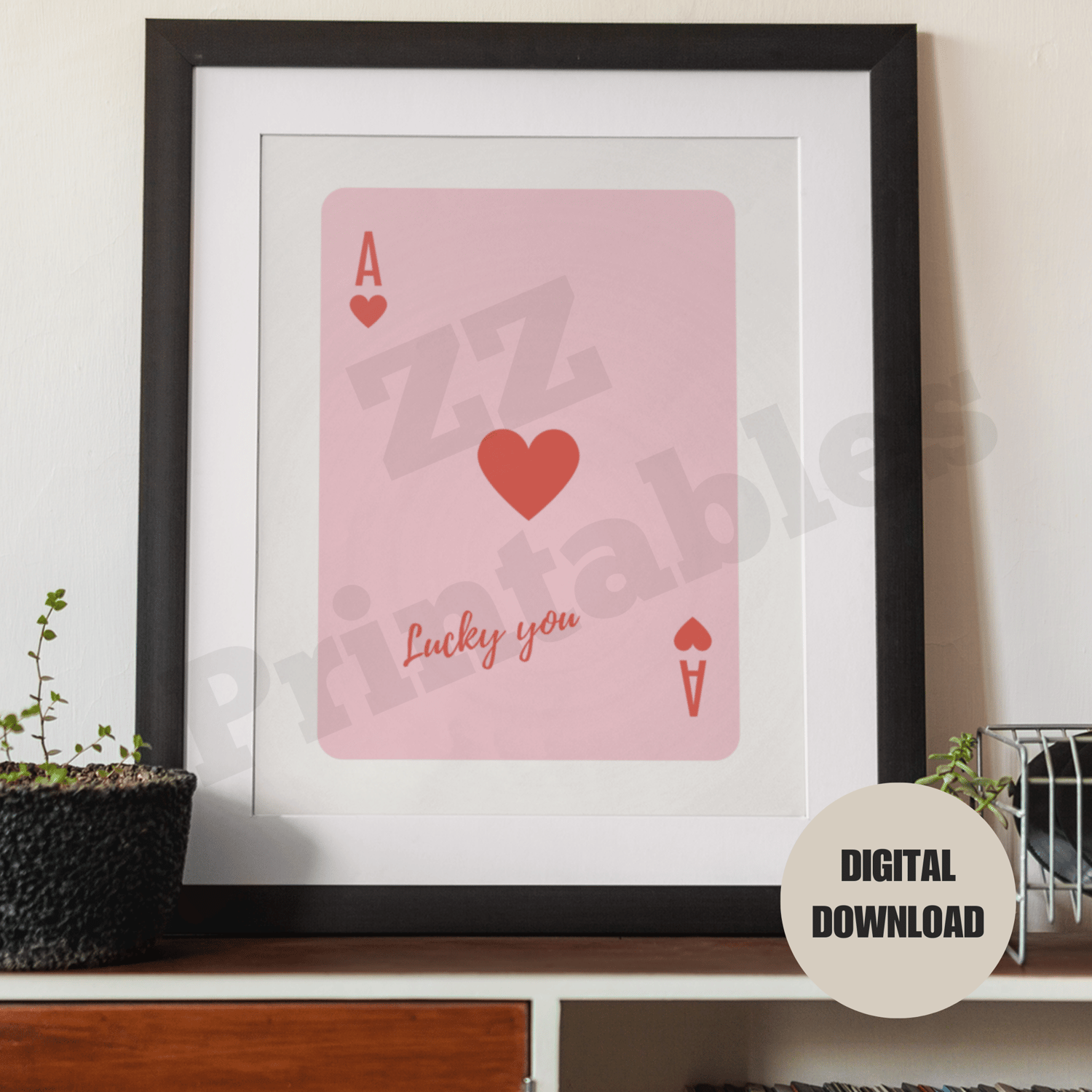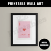Ace of hearts print lucky you poster red and pink trendy retro boho playing card poster home decor printable wall art digital download. The printable comes in 5 different sizes. The digital download consists of a zipped file containing 5 high quality JPEG files (300 dpi) and a PDF size chart to help you choose the right file for the printing size you want.