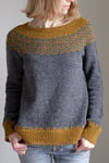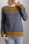 Noux is a circular yoke sweater that is worked seamlessly from top down. The neck ribbing and a couple of increase rounds are worked first, followed by the beautiful stranded section. After that, some raglan shaping and short rows are added to ensure a better fit. Sleeves are then placed on hold and the body is worked toward the hem, adding a bit of A-shaping. The sleeve stitches are then placed on the needles again and worked in the round toward the cuffs. The pattern includes a photo tutorial for German short rows. Please note that the stranded pattern is charted only.