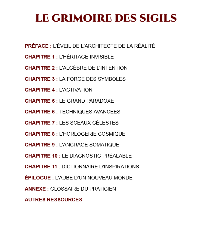Ce guide complet vous initie à l'art ancestral des Sigils : la méthode pour coder vos désirs en symboles actifs, contourner la censure du rationnel et reprogrammer votre inconscient pour manifester des changements concrets.