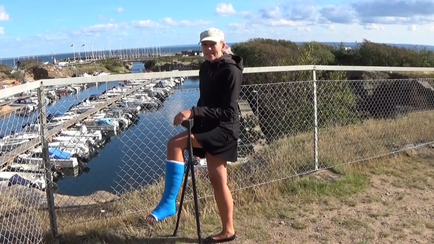 Rose jumps out from the car and crutch first out to a seawalk but soon turn right and crutch along a parking there she stops and looks out over the nice marina which is hidden between the rocks.She crutch down for the steep walkway to the piers.