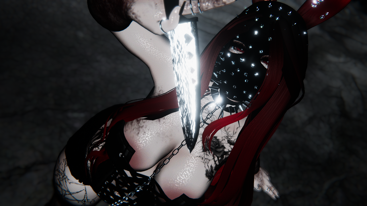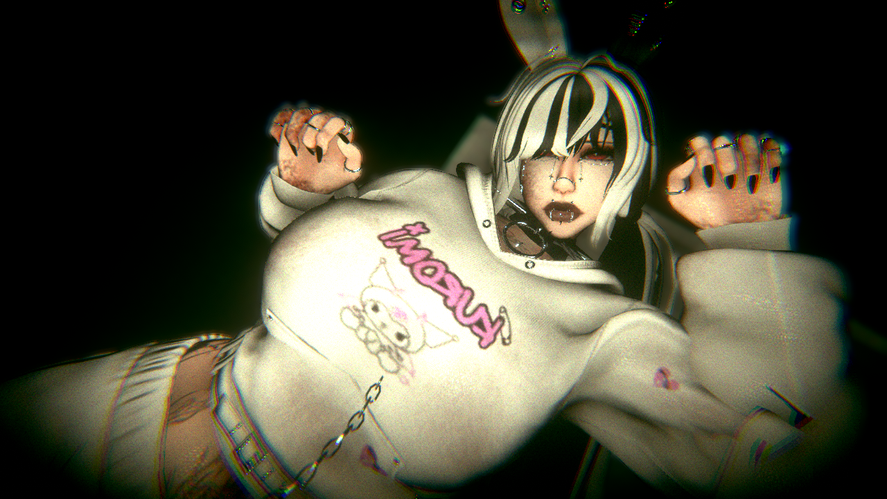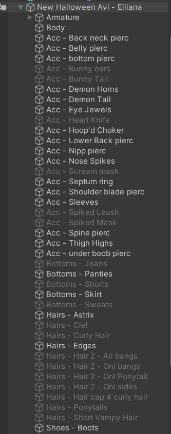 Acc - Choker, Baby Hairs , Thigh Highs , Goth Bunny Ears , Face Acc , Demon Tail & Horns ,Scream Mask , Spiked Mask , bunny tail , Hand Knife , Body Piercings , Spiked Choker/Leash , nose spikes - made by me