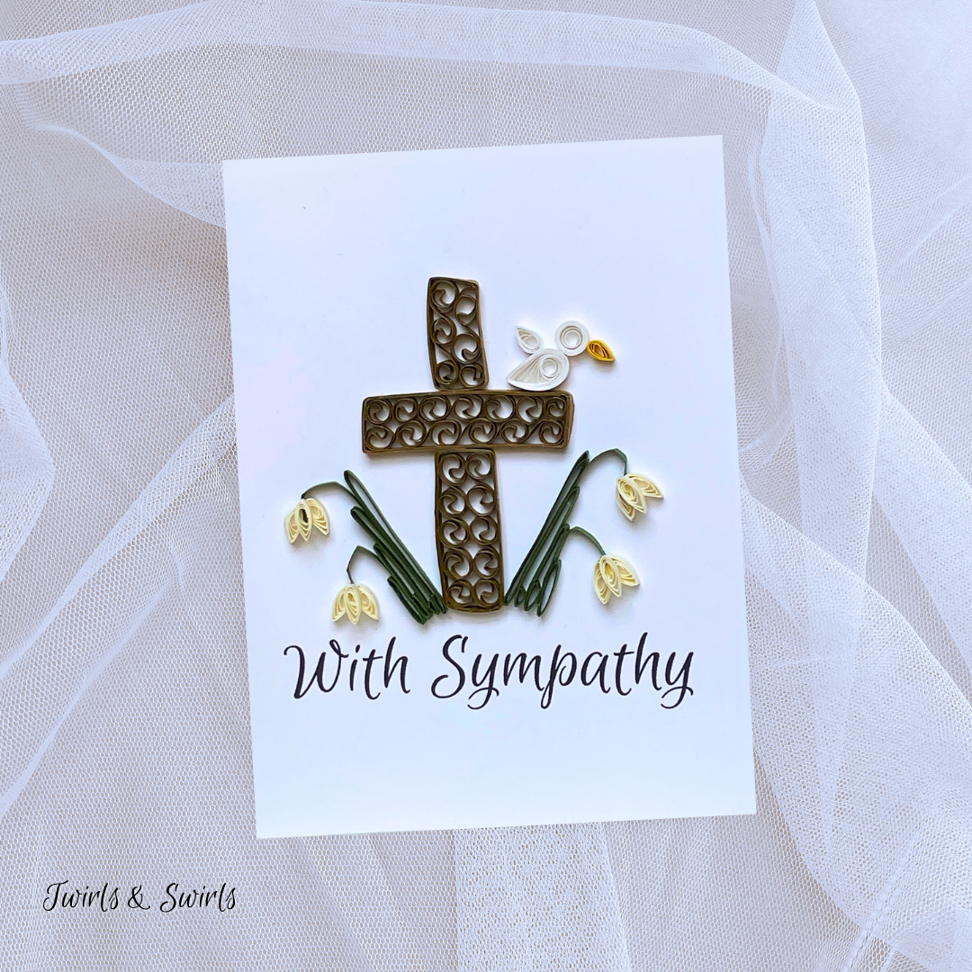 Express your heartfelt condolences with this beautifully handcrafted sympathy card. Featuring an intricately quilled cross on the front, this card offers a gentle and elegant way to convey your sympathy and support during a difficult time. Each detail of the cross is meticulously crafted by hand, ensuring that every card is a unique piece of art.