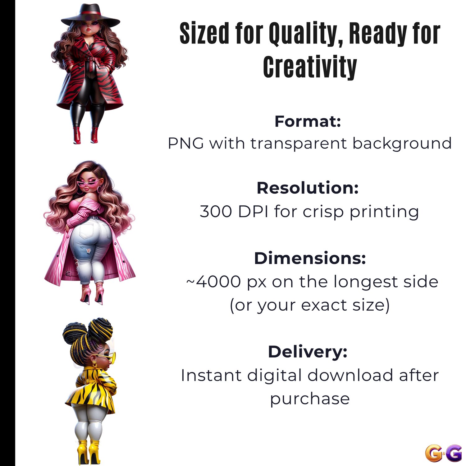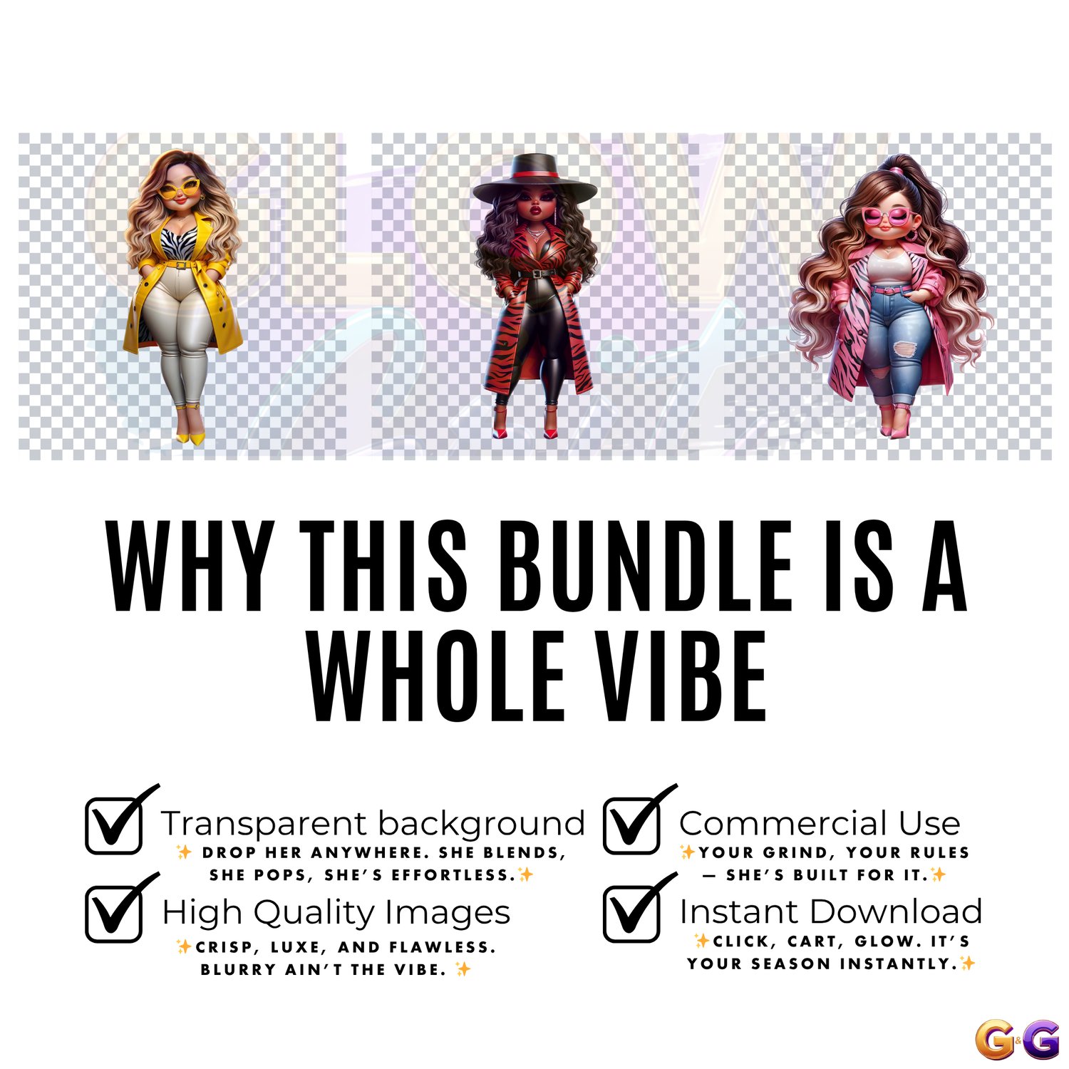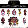 Afrocentric fashion clipart bundle featuring stylish, curvy Black women in high fashion looks perfect for planners, wall art, mugs, and creative projects that radiate confidence.