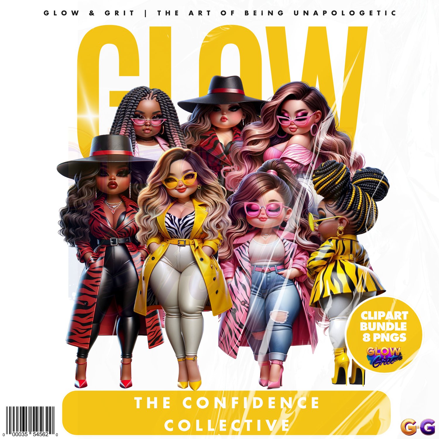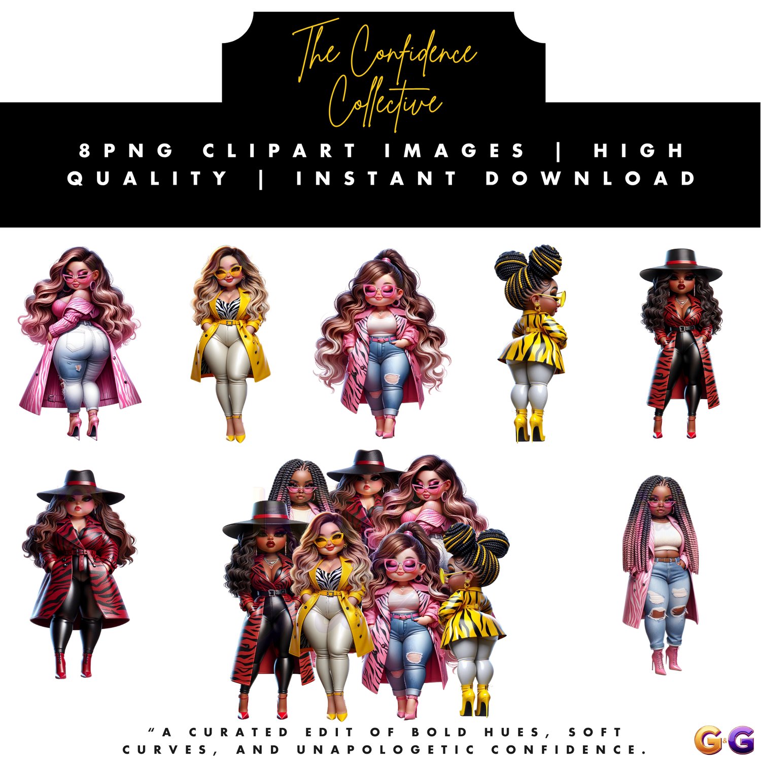 Step into The Confidence Collective, a powerhouse clipart set designed for creators who walk in self-assurance and style. Featuring eight bold Afrocentric dolls in high-fashion fits, this bundle celebrates unity, individuality, and the radiant glow that comes from owning your lane. Perfect for planners, wall art, merch, and digital projects that inspire empowerment with every glance.