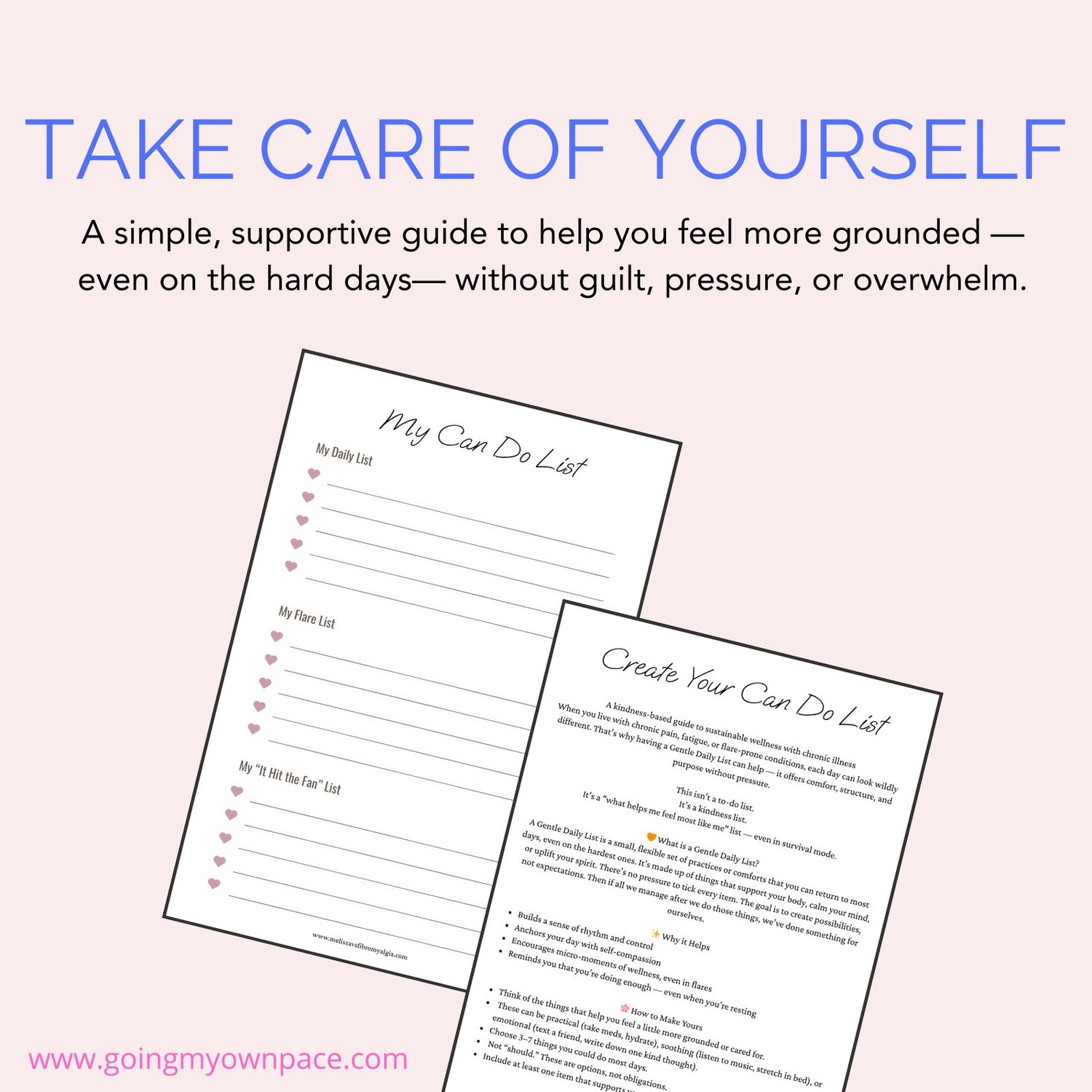 Living with chronic illness, pain, or fatigue means your energy changes day to day. The Your Can Do List is an easy-to-understand guide and worksheet that helps you create a personal rhythm — one that’s flexible, kind, and totally realistic for your life.