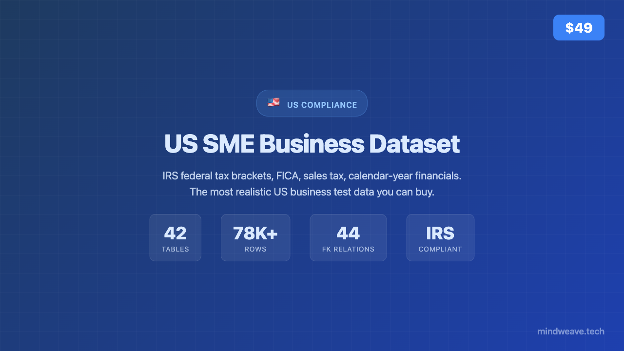 Complete US SME business dataset — "Summit Outdoor Gear LLC" (Colorado). 42 interconnected tables with 78,000+ rows and 44 foreign key relationships. IRS 2024 federal tax brackets, FICA (Social Security 6.2% + Medicare 1.45%), state sales tax, 401(k). Every transaction traces end-to-end: Customer → Order → Invoice → Payment → Bank → Journal Entry. Double-entry accounting that always balances. Formats: CSV + SQL (PostgreSQL) + Parquet + SQLite. Perfect for ERP testing, QA, ETL pipelines, consulting demos, and AI training data.